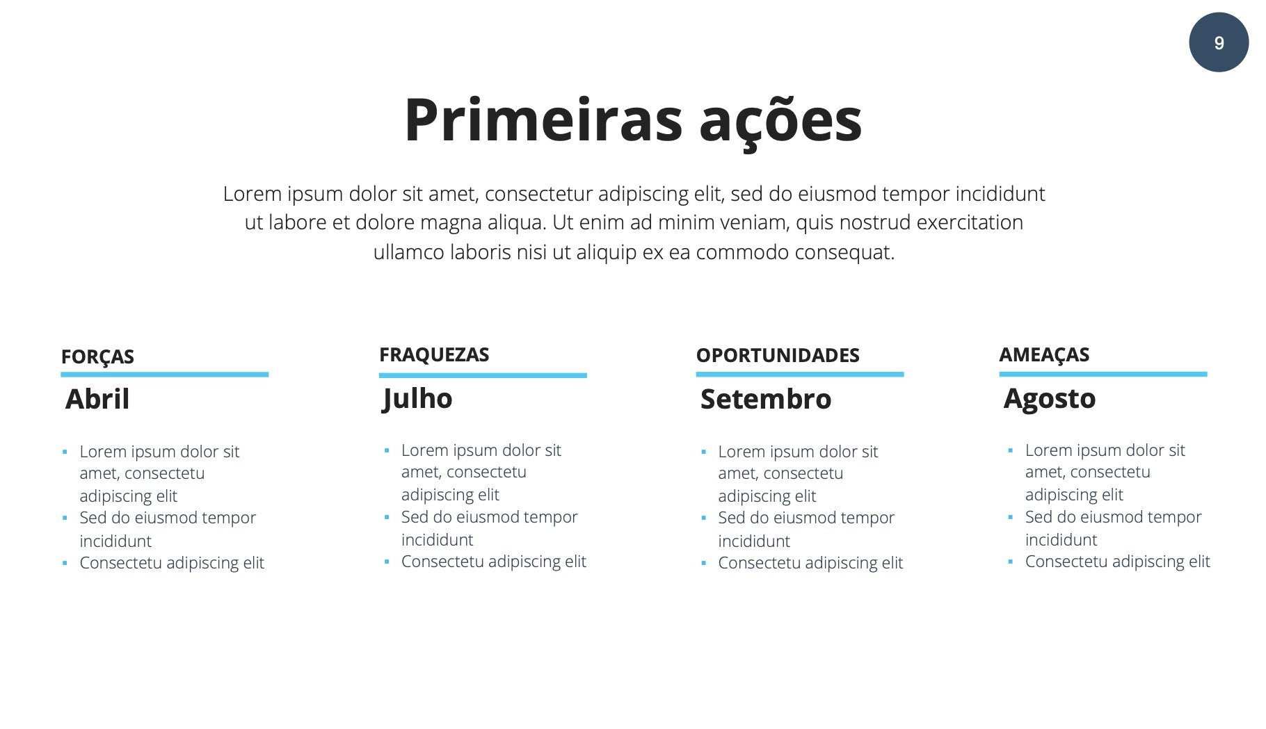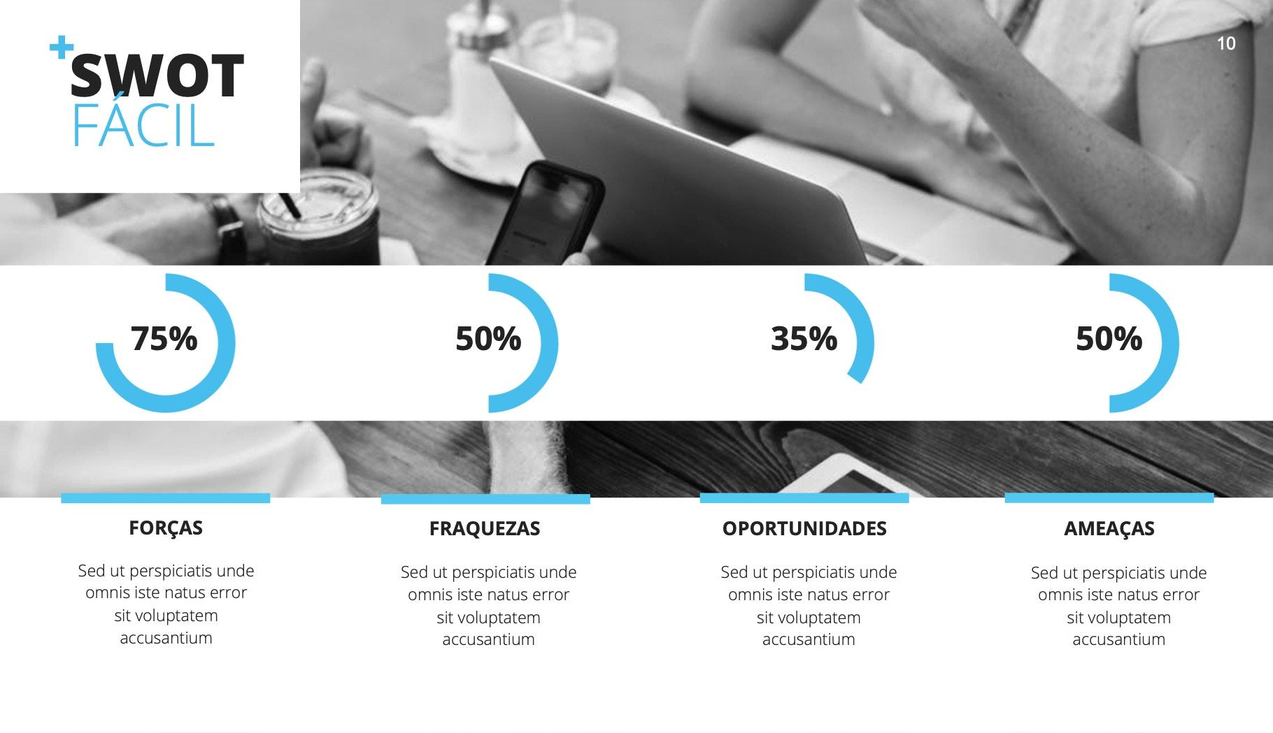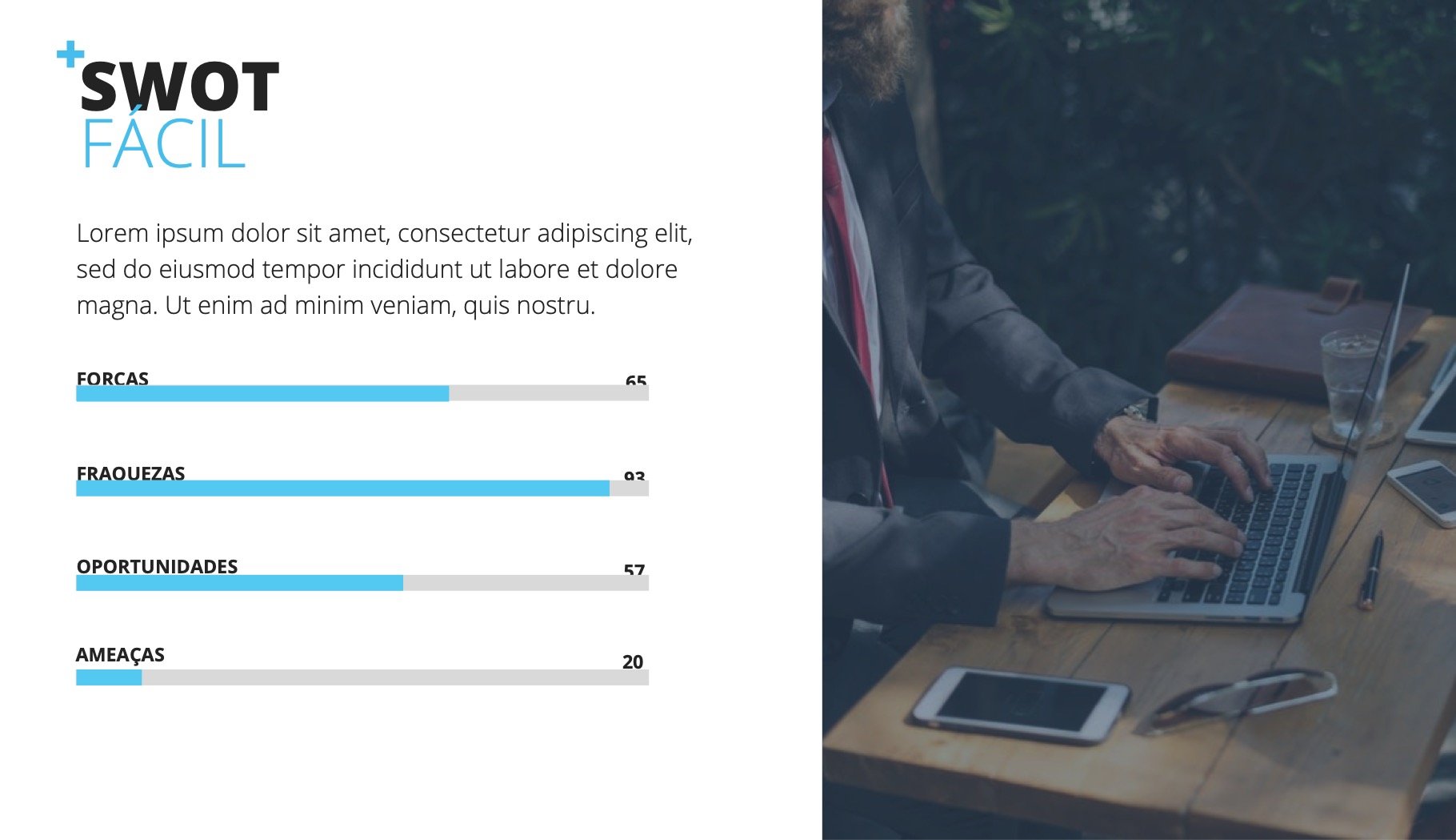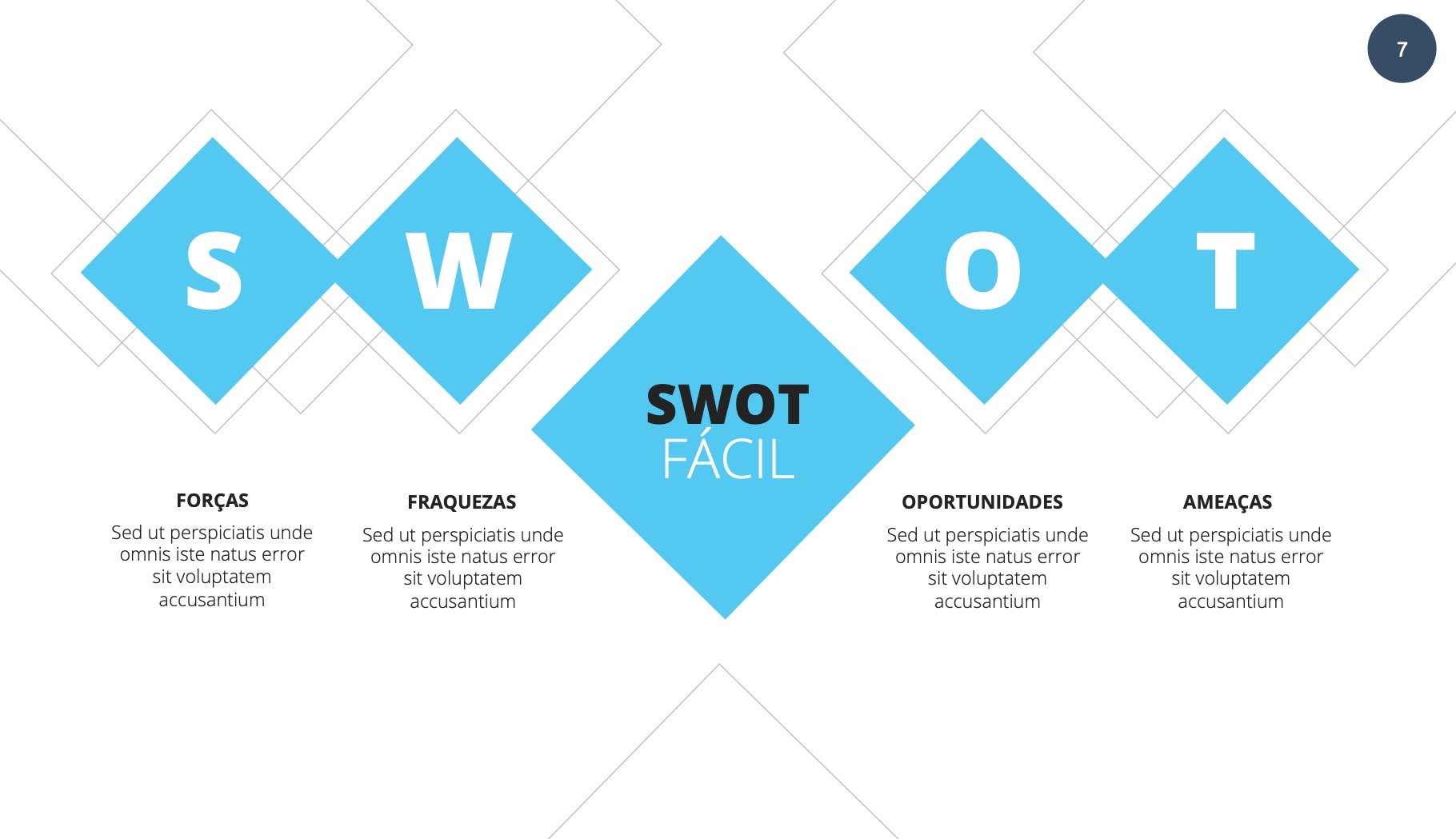 A Apresentação Análise SWOT em Google Slides é a maneira ideal para você apresentar uma análise SWOT (FOFA) em sua empresa ou faculdade de forma profissional e com muito estilo.