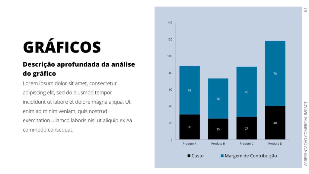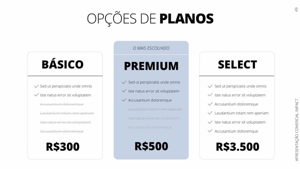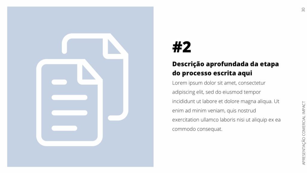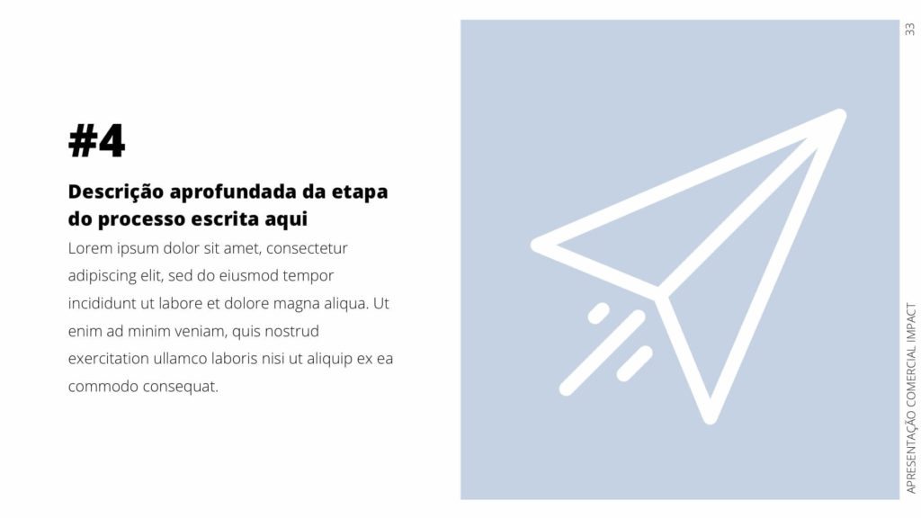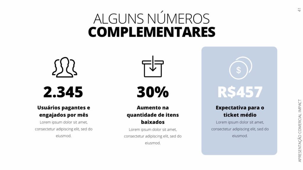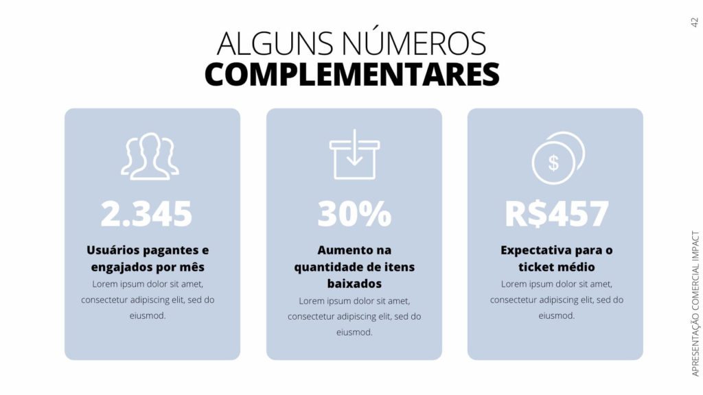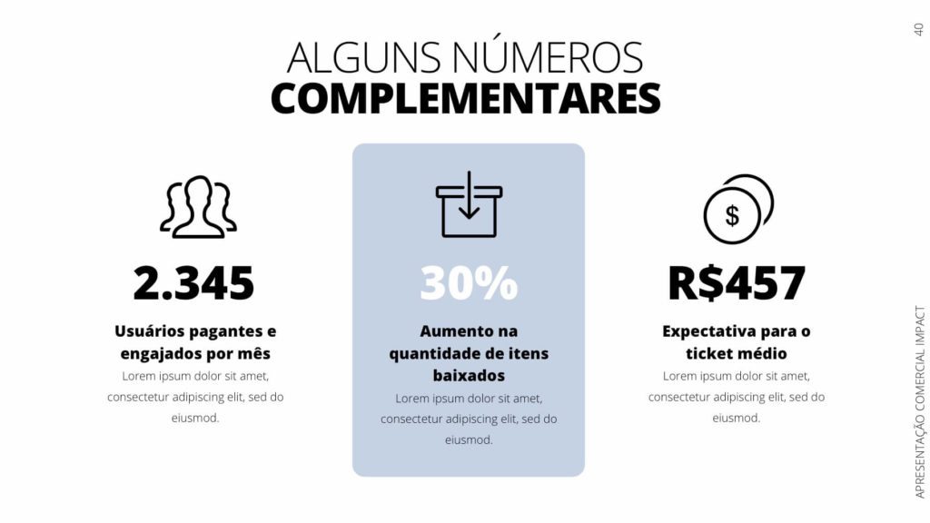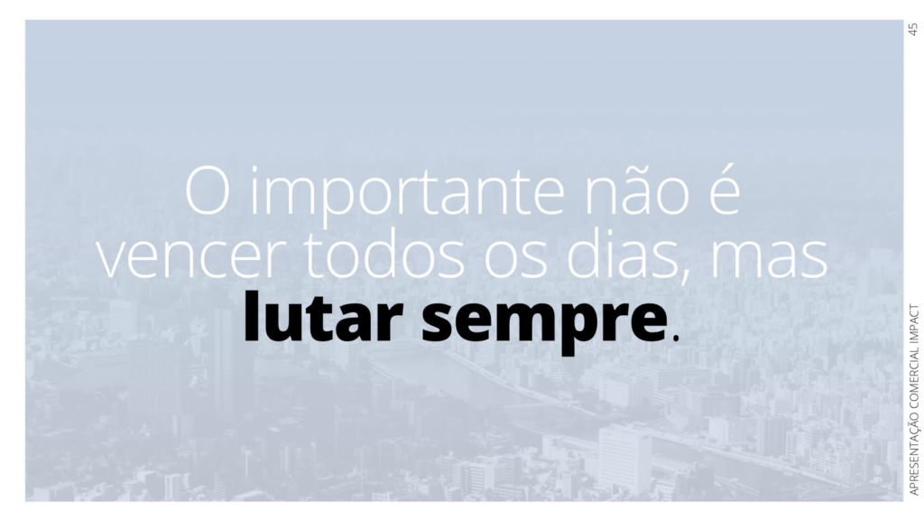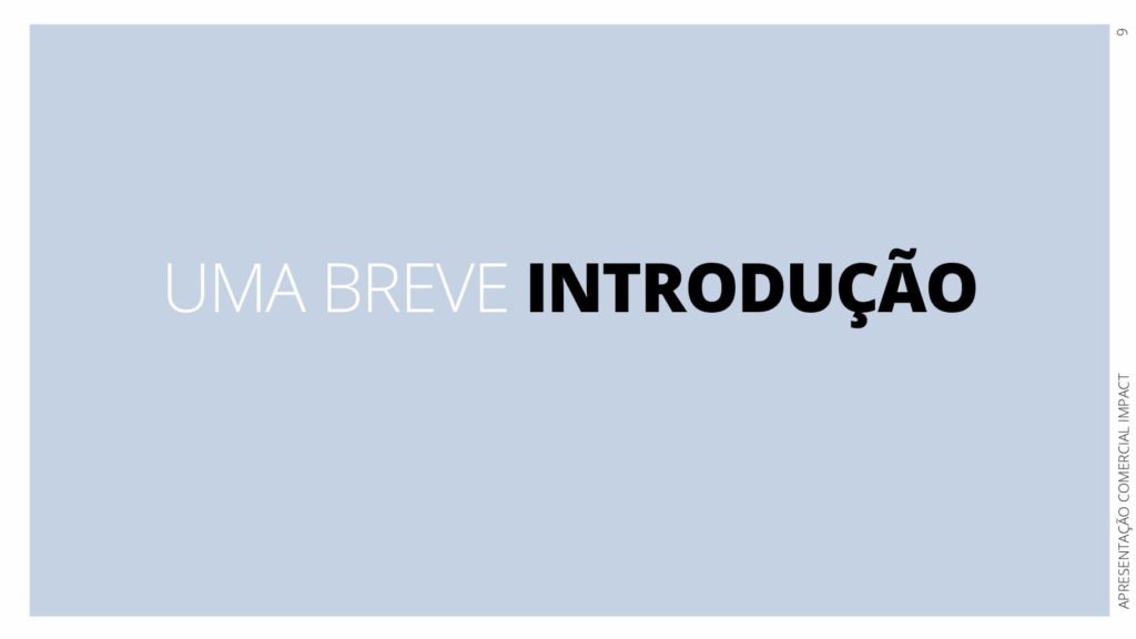 Apresentação Comercial PPT Impact completa contendo todos os slides necessários para você apresentar sua empresa, produtos e serviços, equipe e muito mais para seus clientes e parceiros! Economize tempo e dinheiro! Tenha mais impacto com menos esforço.