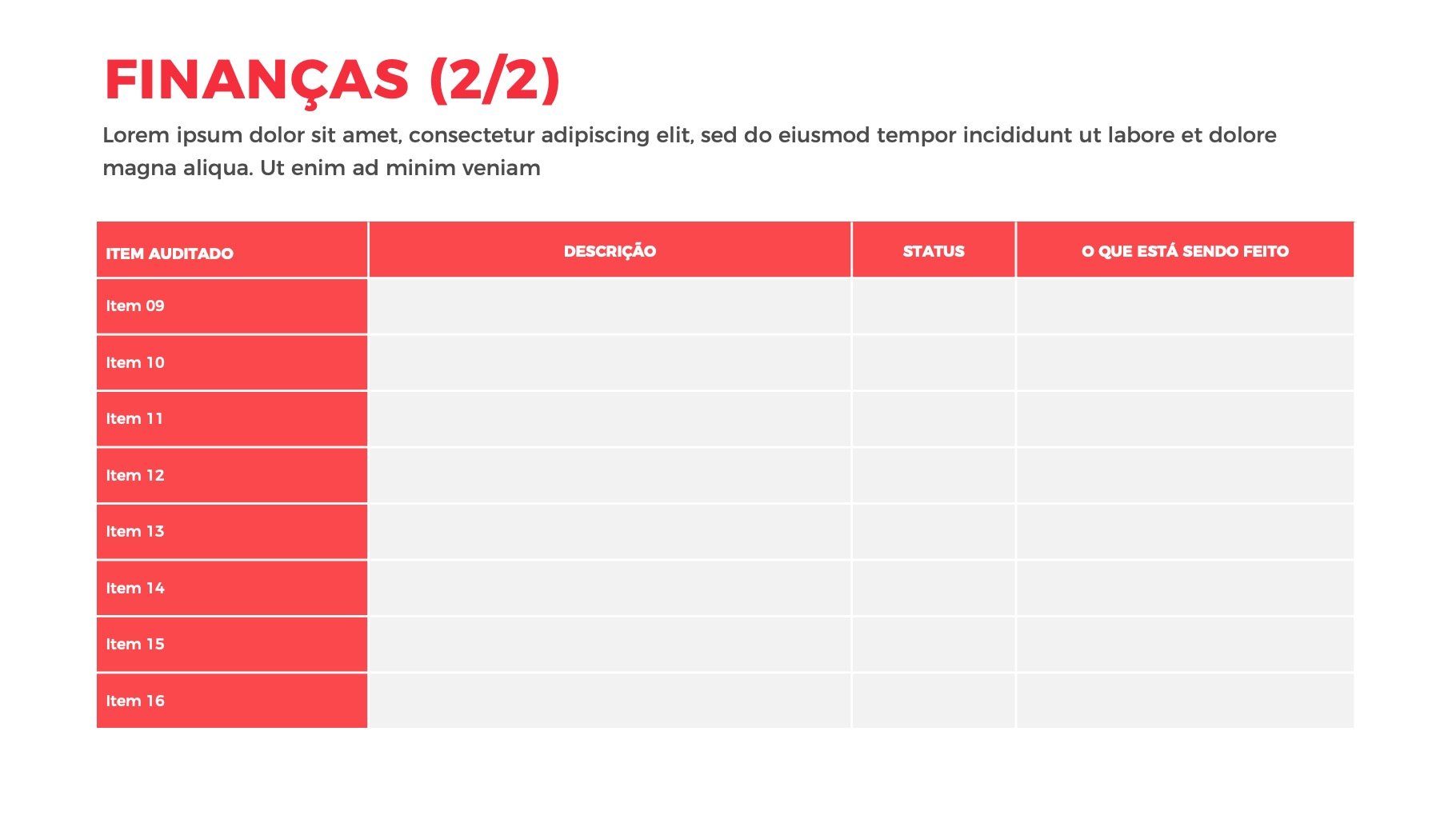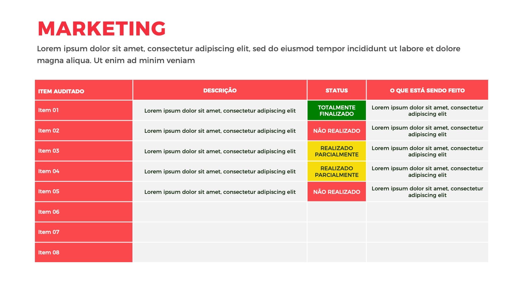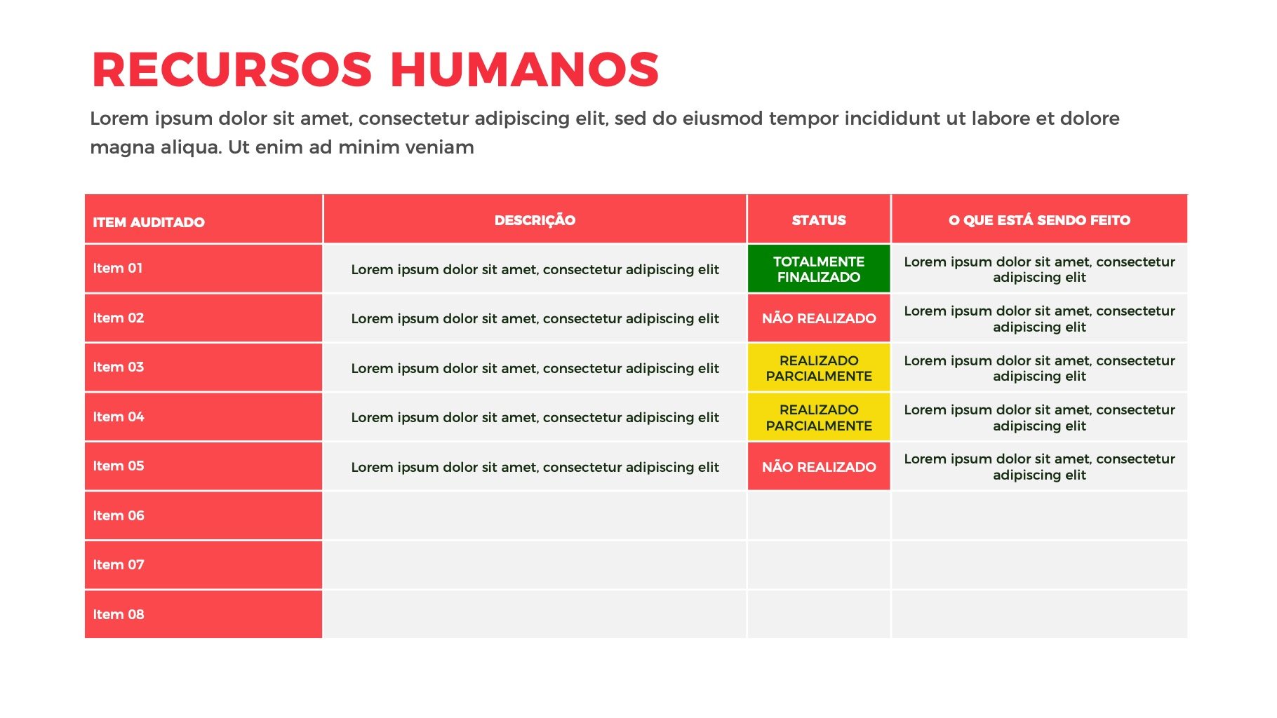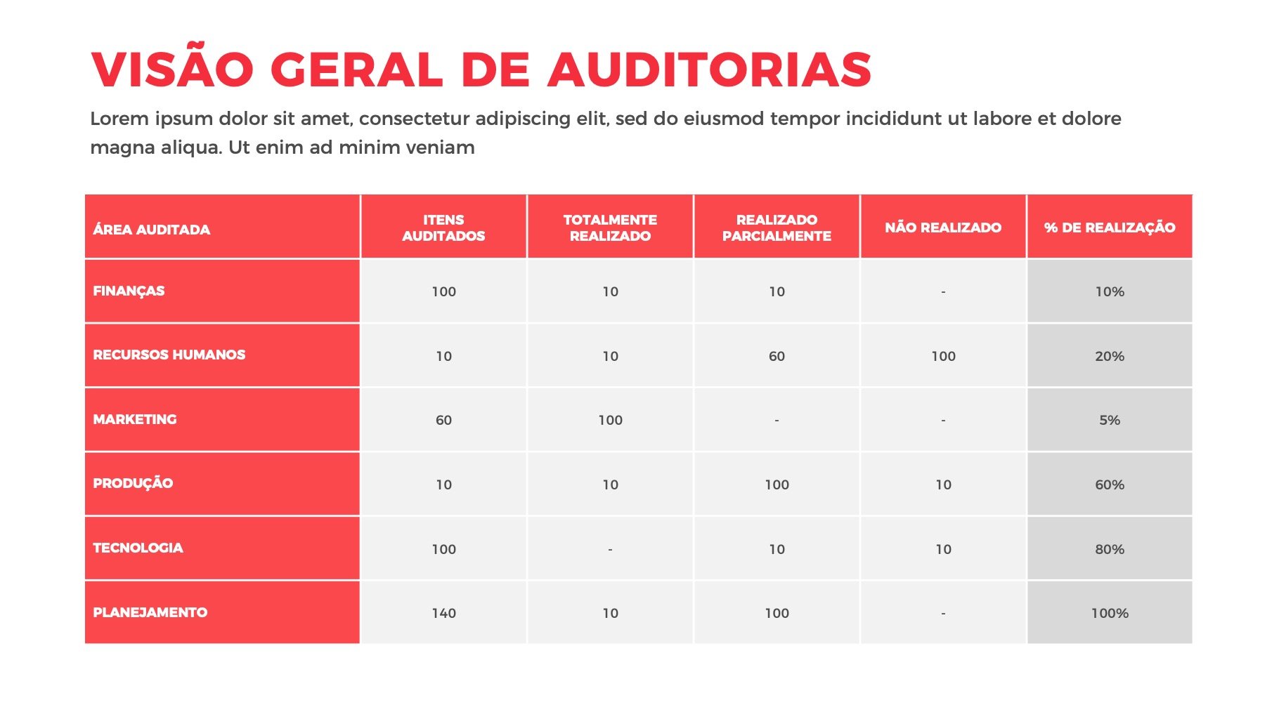 A Apresentação de Auditoria Interna é um tema de powerpoint perfeito para quem precisa fazer um controle administrativo e apresentar resultados.