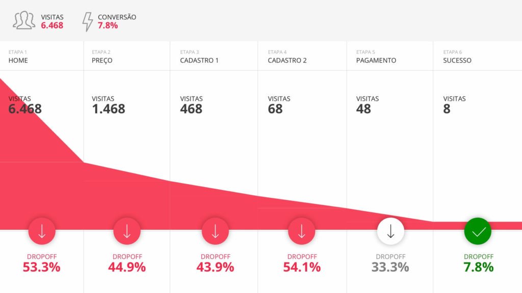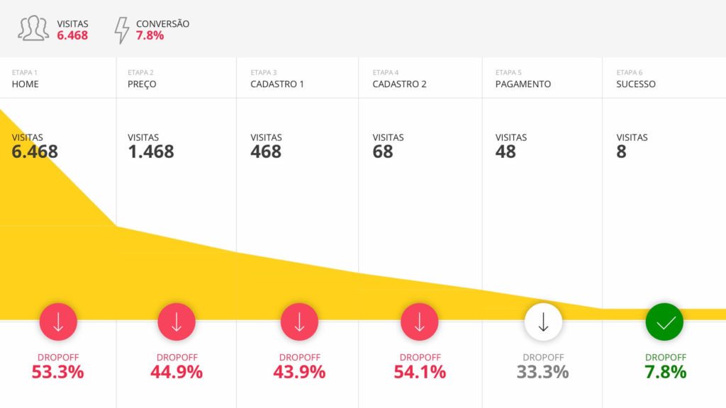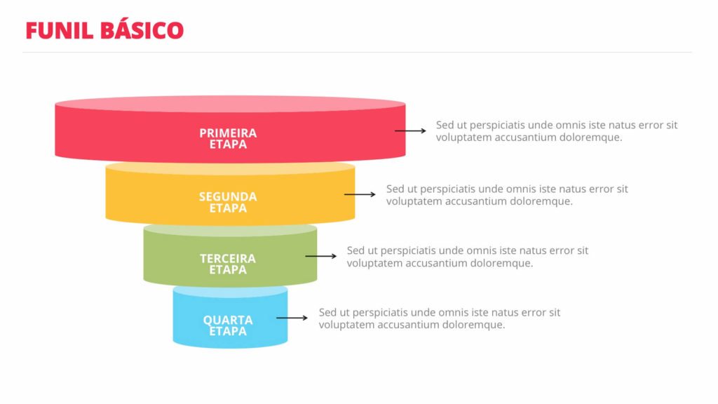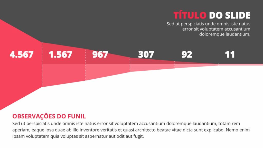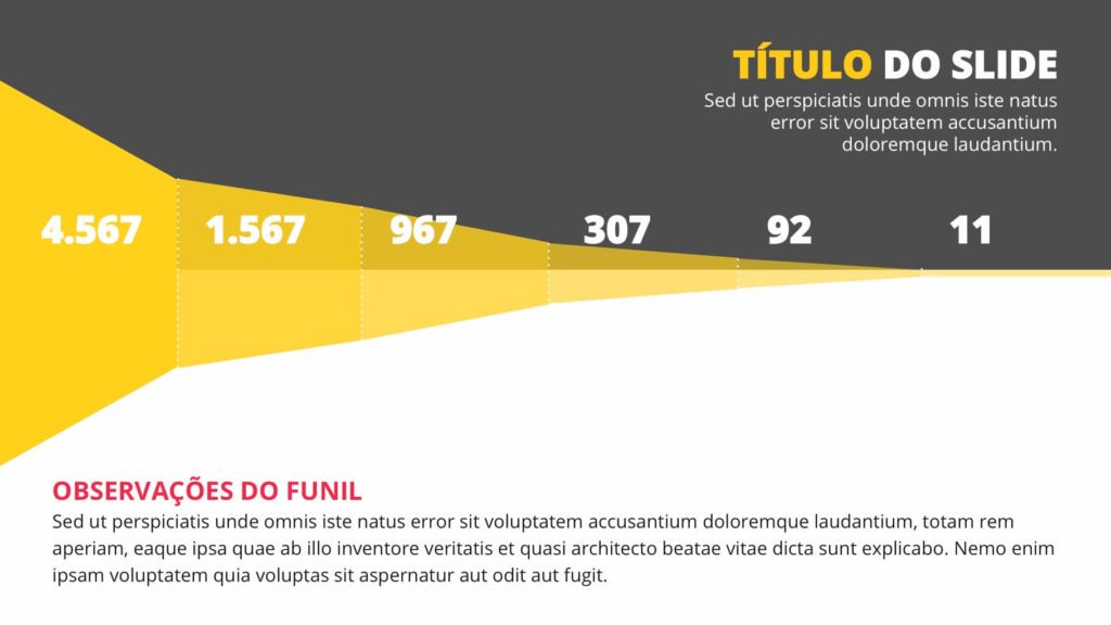 Com 18 slides em Microsoft Powerpoint variados, o usuário poderá escolher entre os gráficos de funil de vendas que mais lhe agradarem para fazer uma análise minunciosa da taxa de conversão de cada uma das etapas do funil.