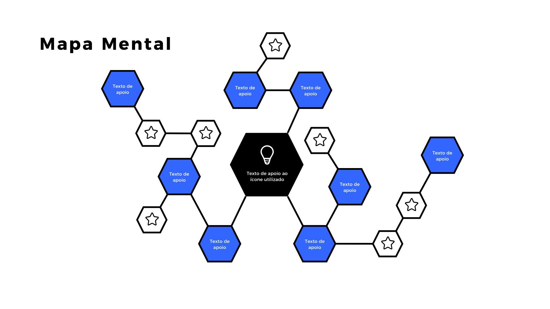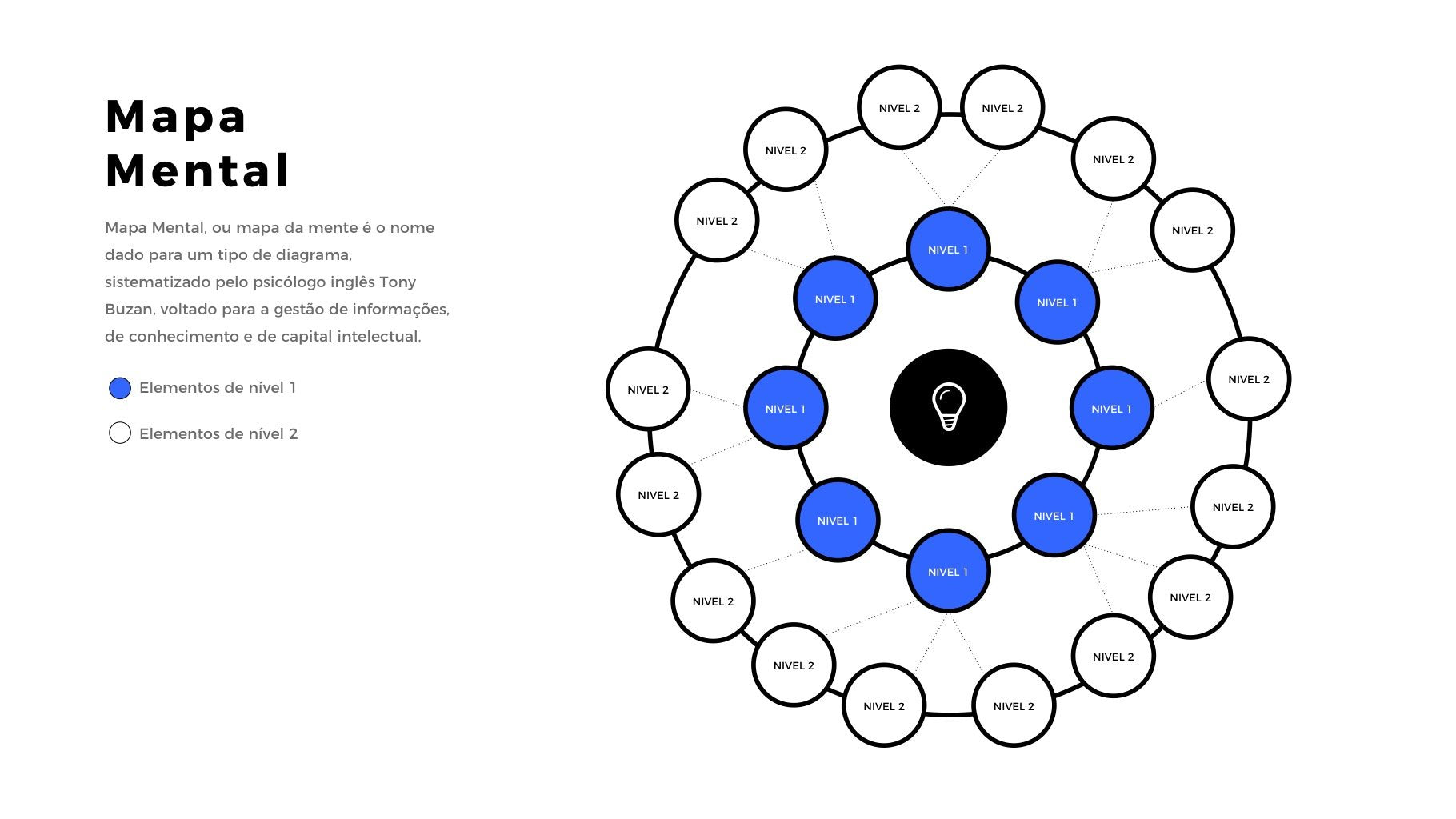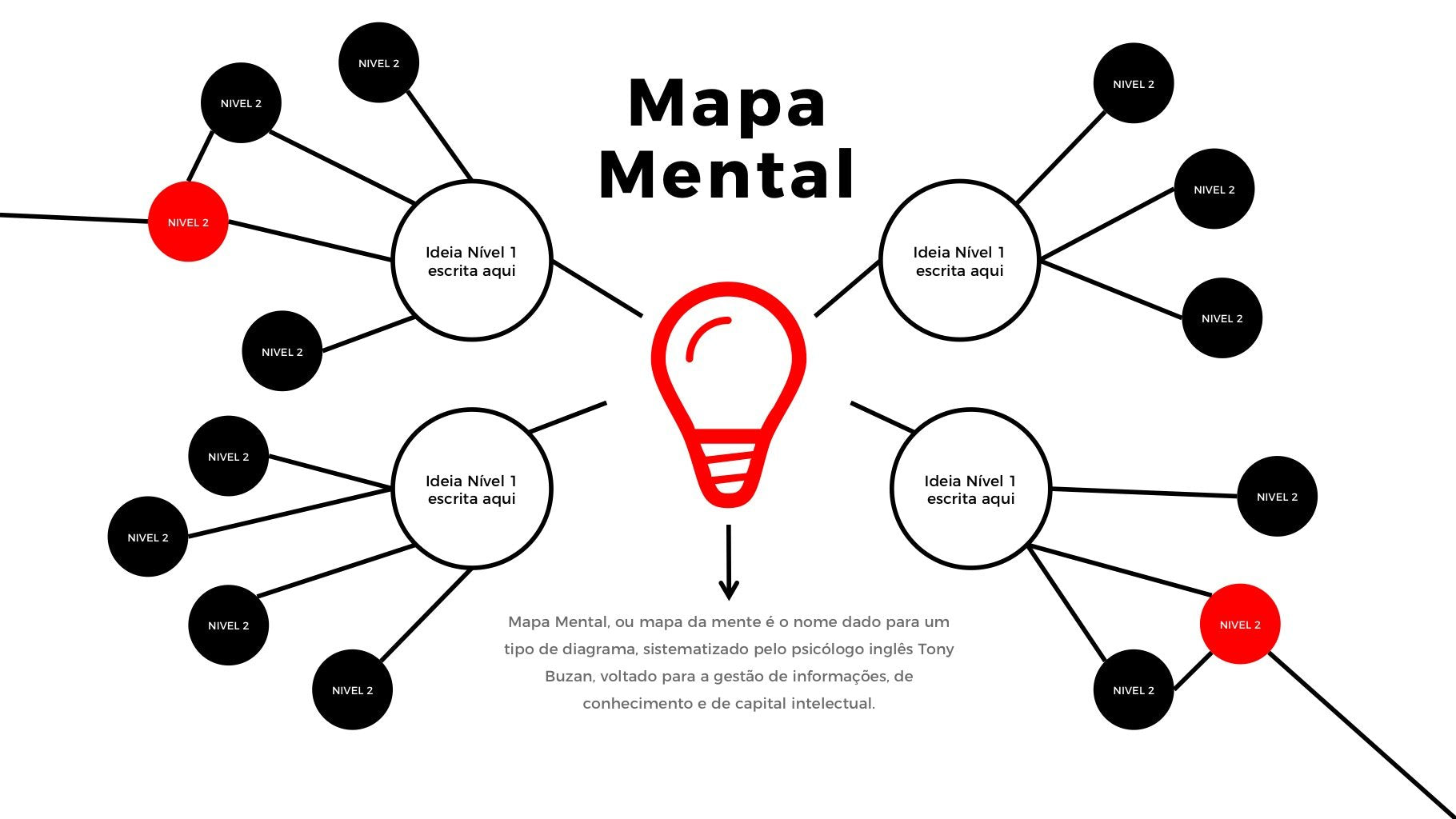 A apresentação de Mapa Mental Flex Map é ideal para quem quer mostrar o resultado de um brainstorm ou da relação entre diferentes tópicos ou até mesmo a arquitetura de informação de um website. São inúmeras as possibilidades.