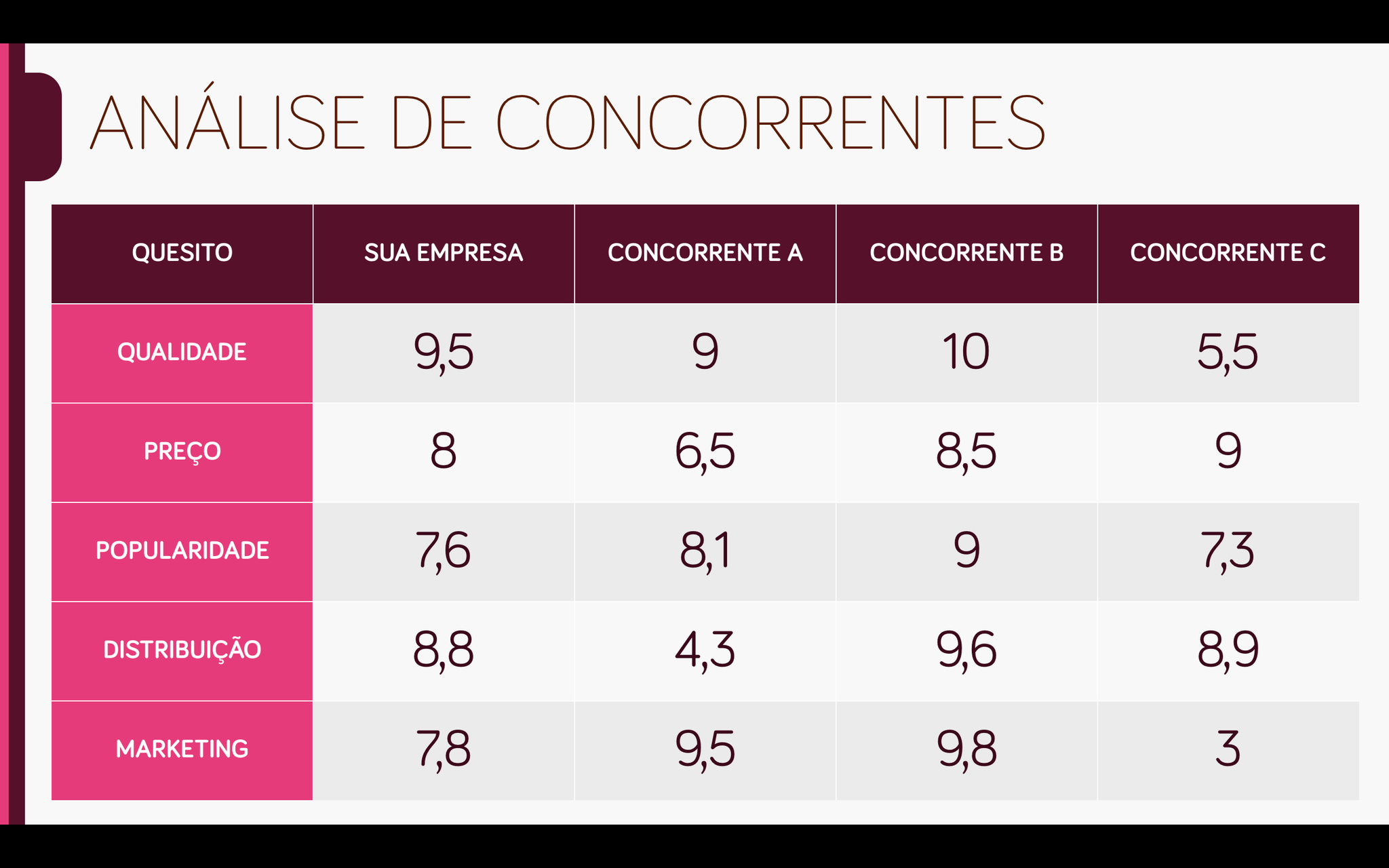 São mais de 50 slides 100% editáveis em Microsoft Powerpoint e Apple Keynote para essa apresentação. Isso significa que você pode alterar imagens, textos, gráficos e tabelas com as suas informações, além de poder também alterar cores e fontes se assim desejar.