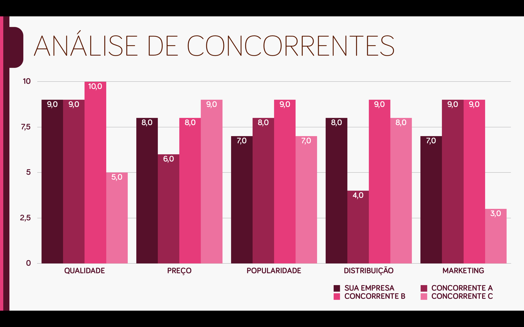 Um Planejamento Estratégico deve englobar como etapas uma Análise SWOT, a definição de Missão, Visão e Valores da empresa, Análise dos Concorrentes, Mapa estratégico, Balanced Scorecard e a definição de Metas e de Planos de Ação a serem executados. A Apresentação de Planejamento Estratégico vem com slides prontos para receber todas essas etapas e assim você poderá mostrar os resultados do Planejamento para todos.