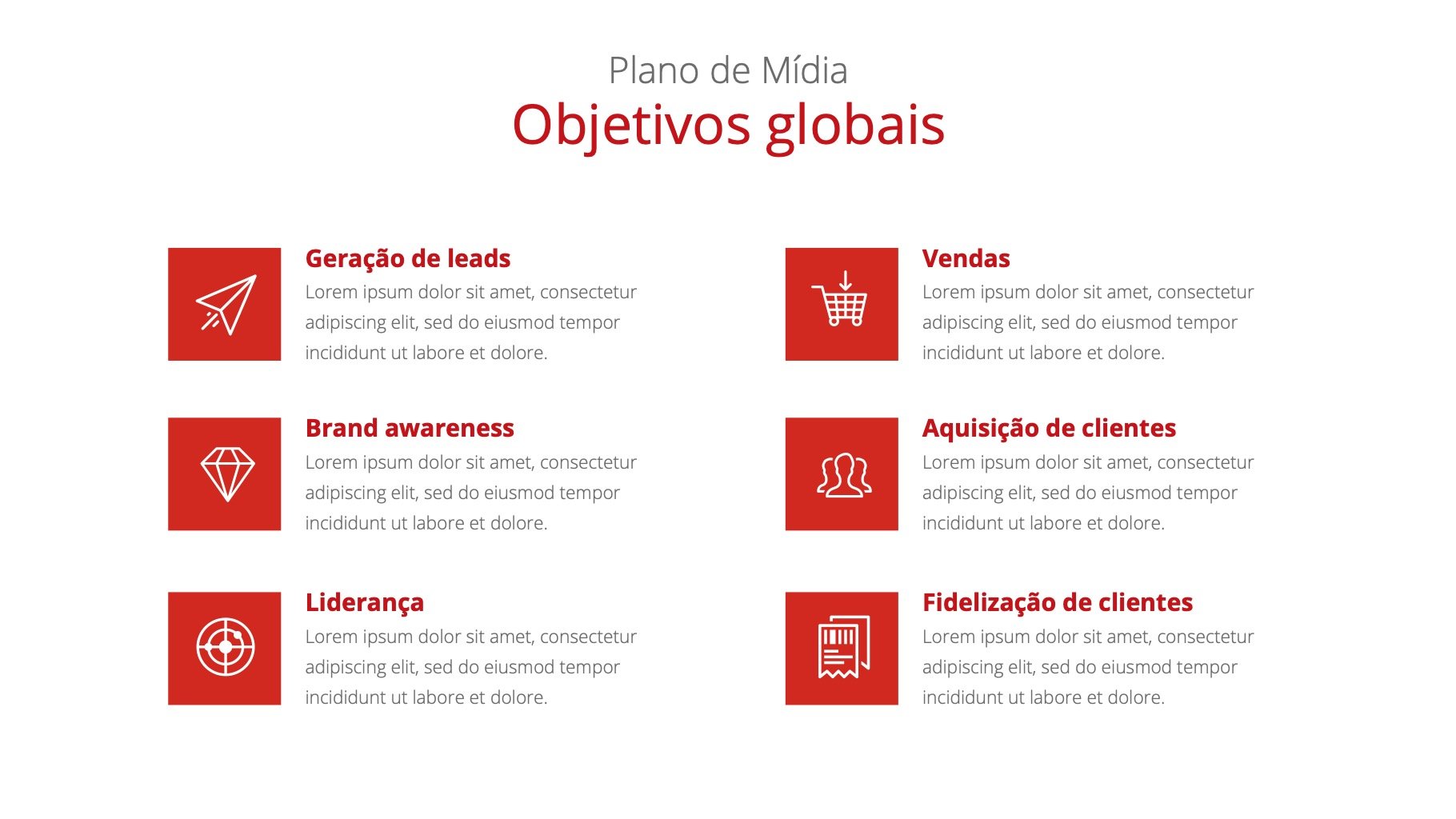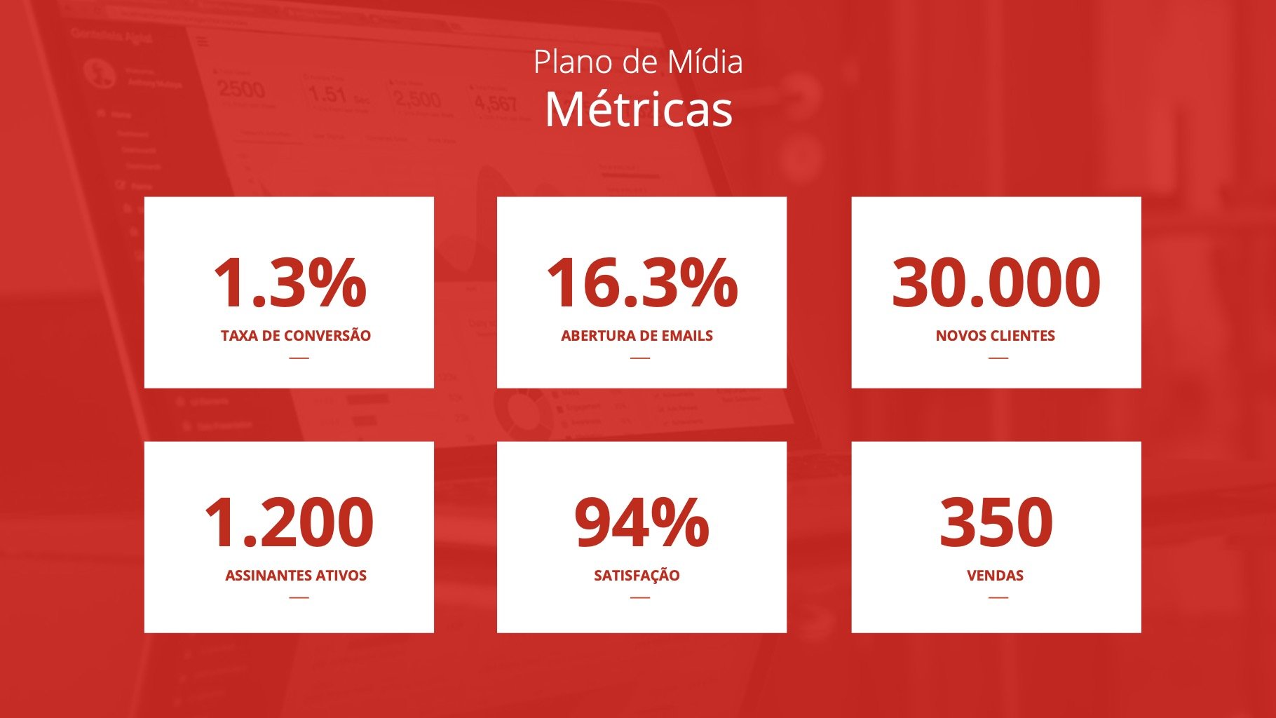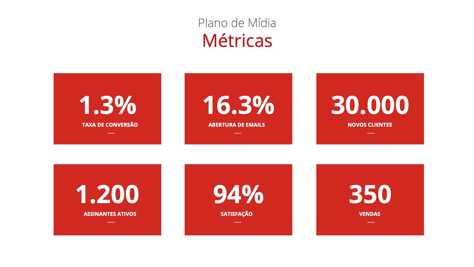 - Plano de Mídia (metas, objetivos, canais)