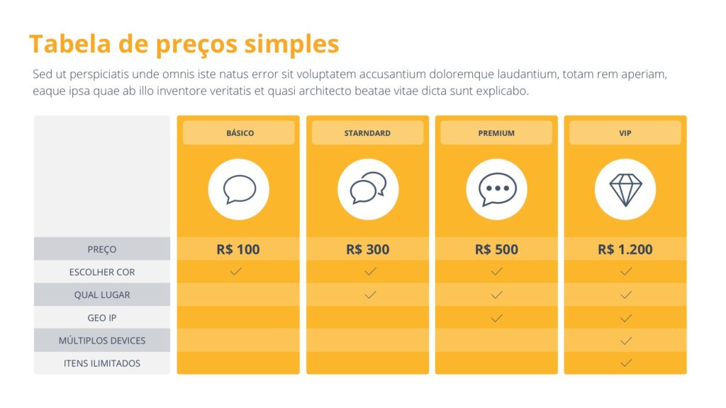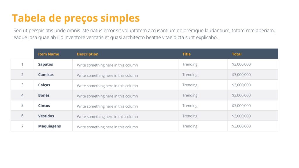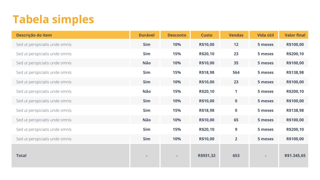 A Apresentação de Tabelas Table Slides é uma excelente forma de adicionar apresentar diferentes tabelas em suas apresentações. Ela possui uma série de alternativas para apresentar informações de forma clara e inteligente.