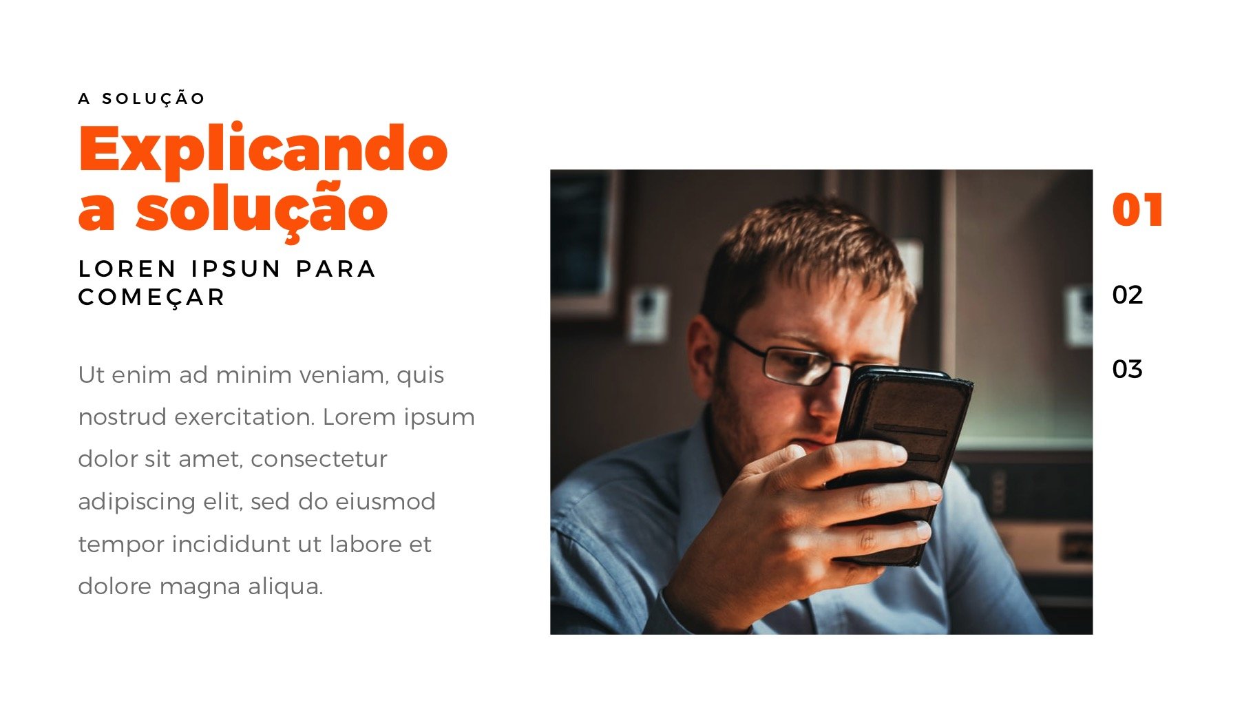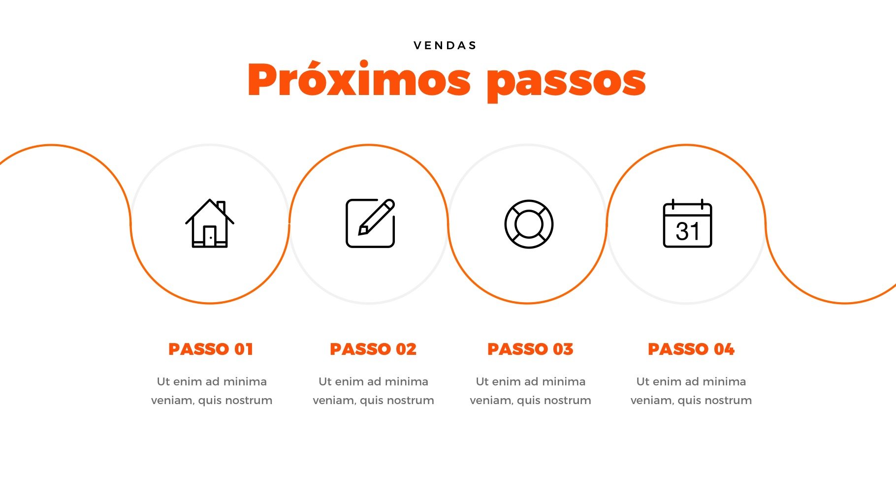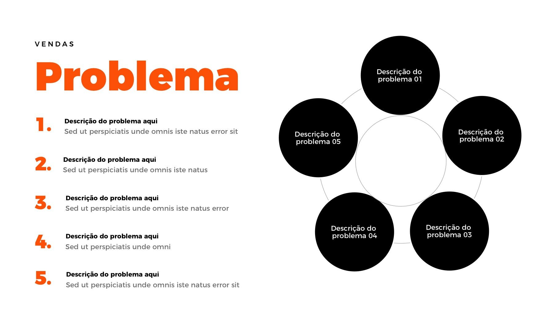 Passar uma boa impressão é fundamental para cativar potenciais clientes e a Apresentação de Vendas da LUZ Slides Prontos é perfeita para isso. Nela você fará uma breve introdução, descreverá o problema e as necessidades enfrentadas por clientes da sua empresa, e mostrará a solução que você oferece. Também existem espaços para depoimentos de clientes, próximos passos, além de um conjunto de ícones para você usar à vontade.