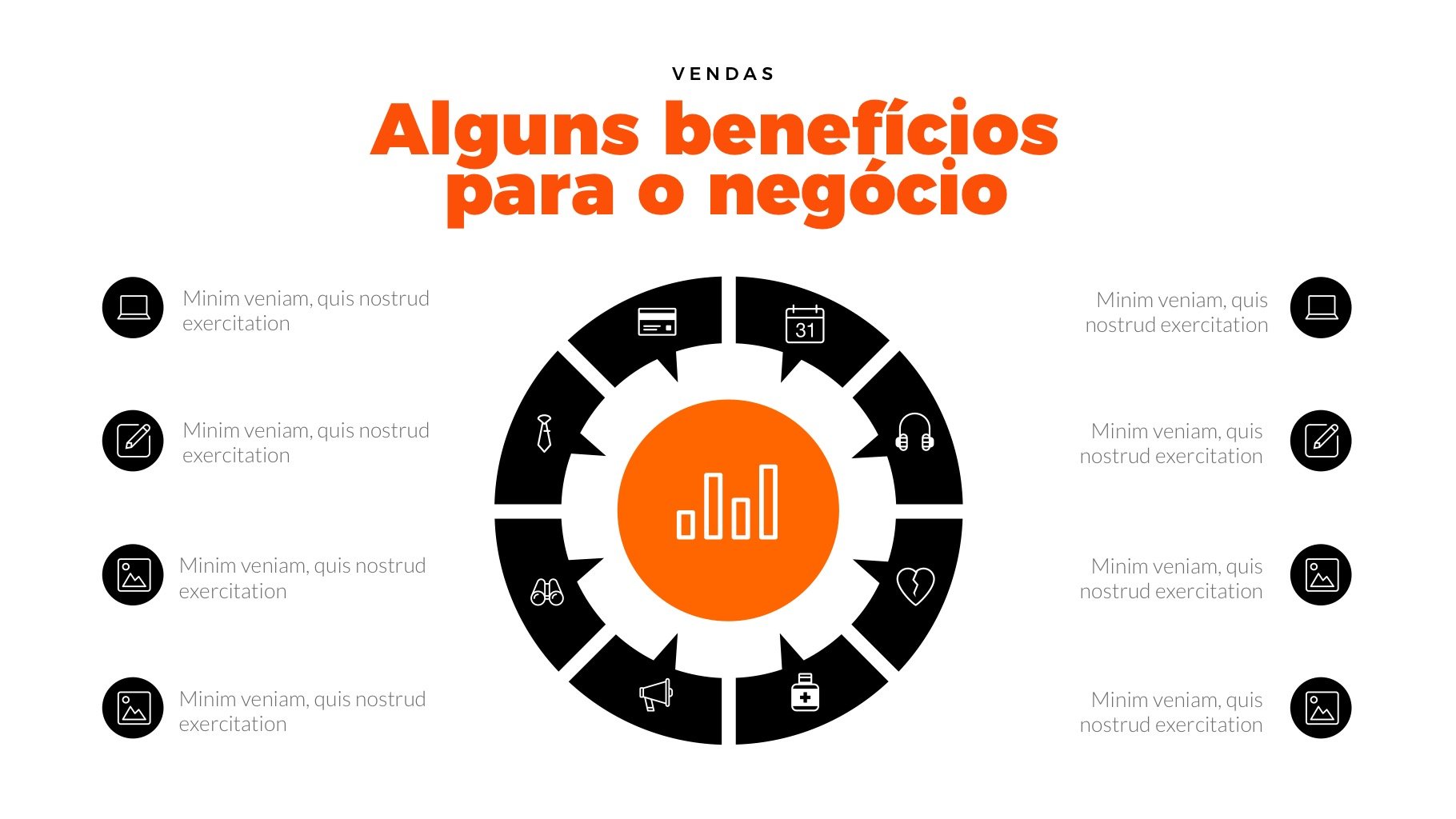 A Apresentação de Vendas é um tema para powerpoint em ppt que possui tudo o que você precisa para apresentar comercialmente sua empresa para potenciais clientes ou parceiros.