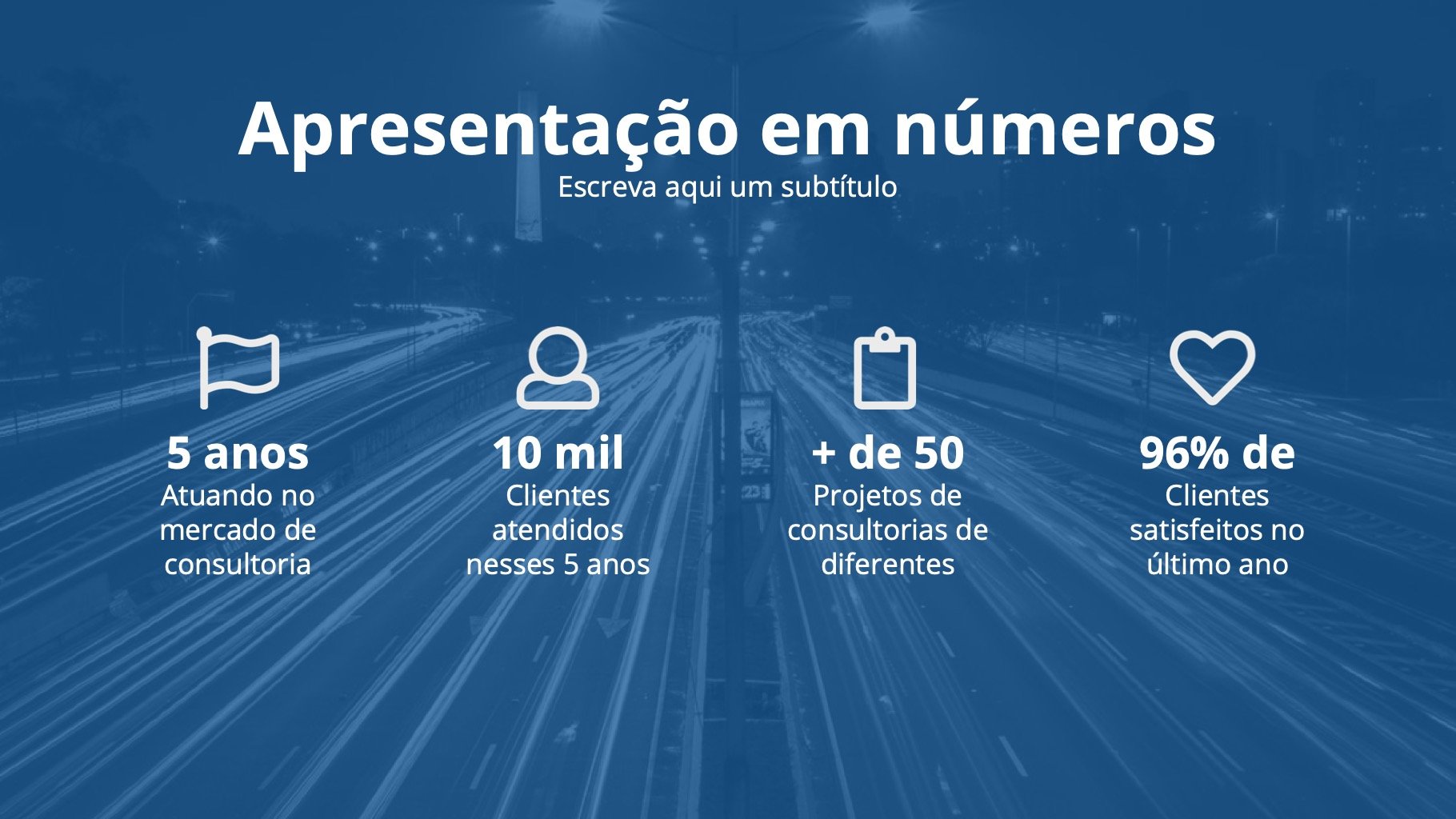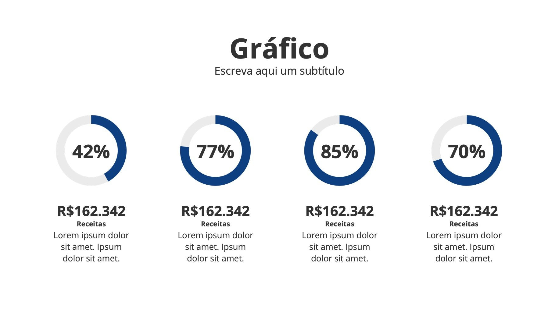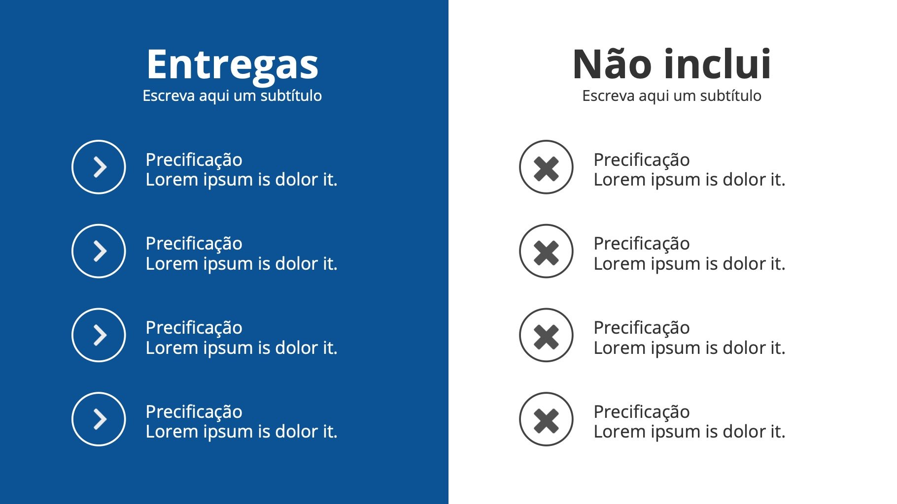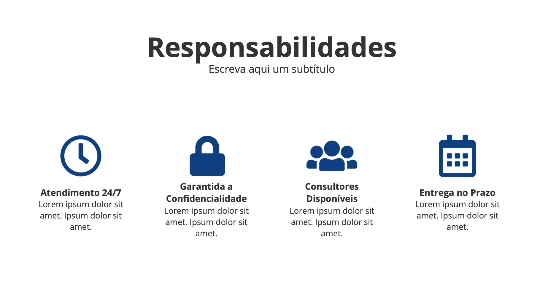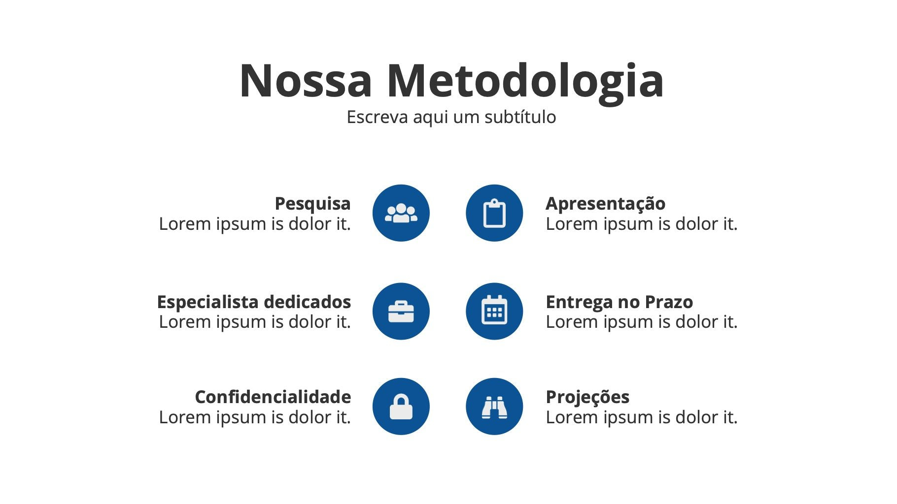 Todos os elementos são 100% editáveis e você poderá alterar facilmente os textos, cores e qualquer elemento da apresentação.
