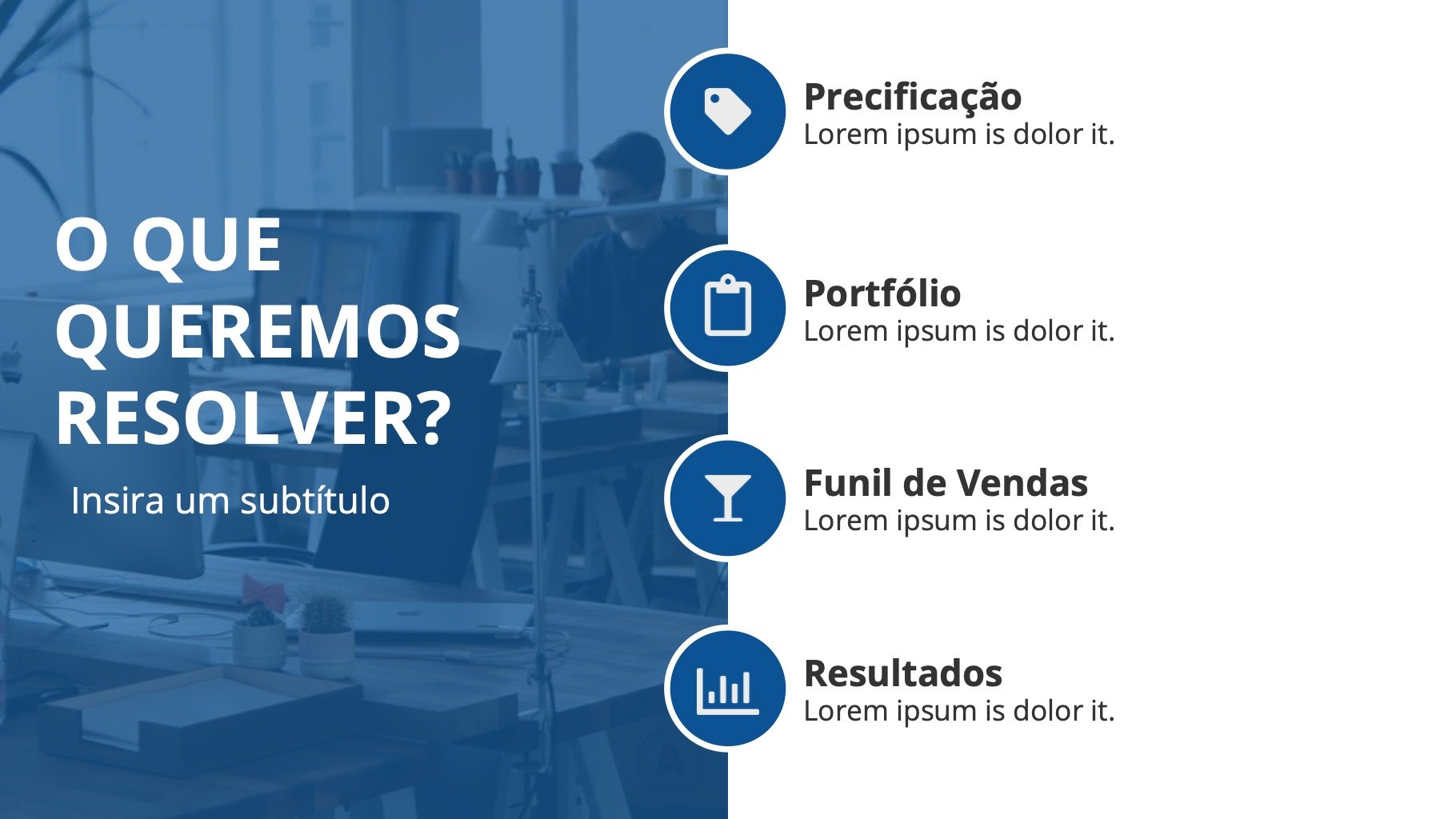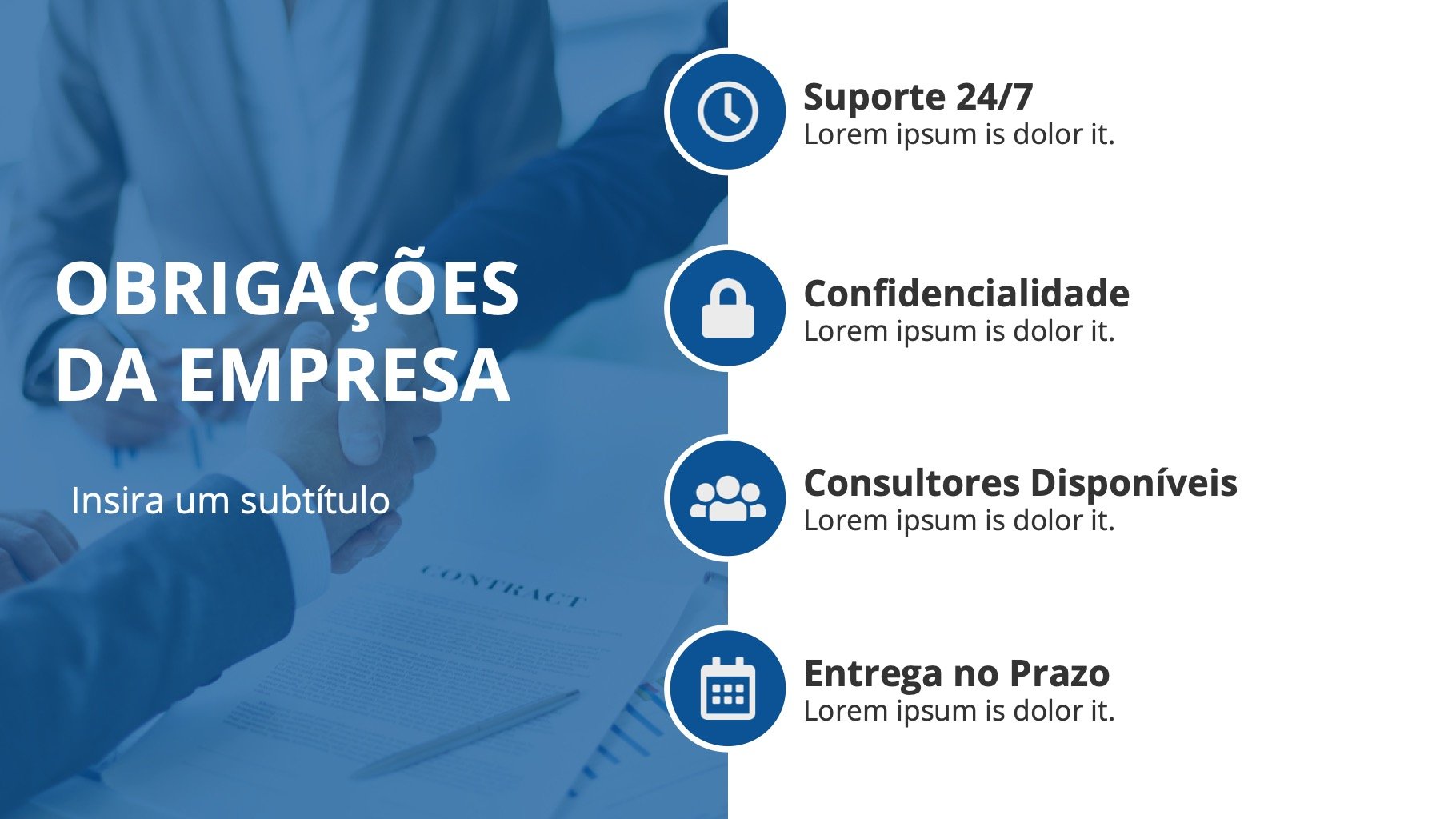 A Apresentação de Vendas para Consultores em Google Slides foi feita para equipes comerciais e de vendas de consultoria que precisam, frequentemente, fazer apresentações de vendas para oferecer seus serviços. Esta Apresentação de Vendas para Consultores em Google Slides e possui todos os recursos necessários para que você faça uma apresentação impactante e visualmente agradável em apenas poucos minutos.