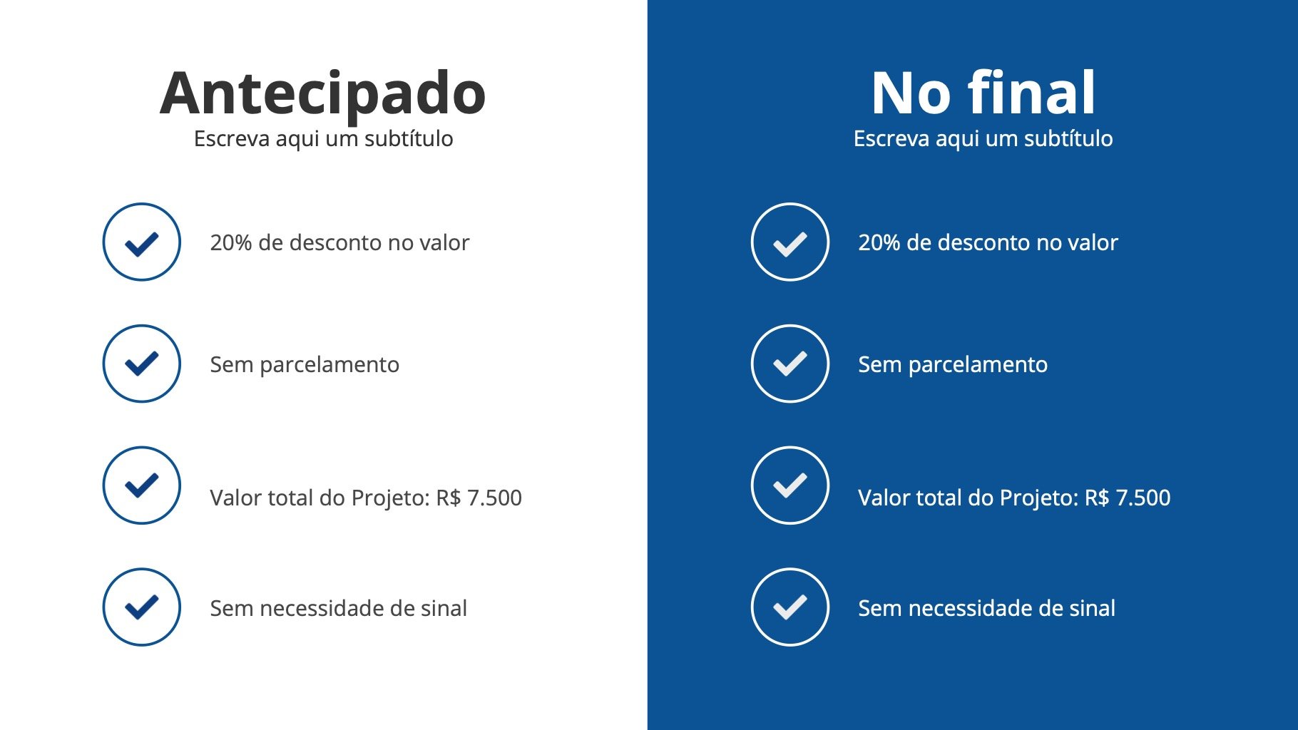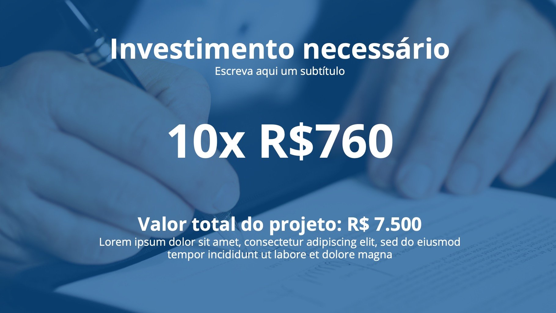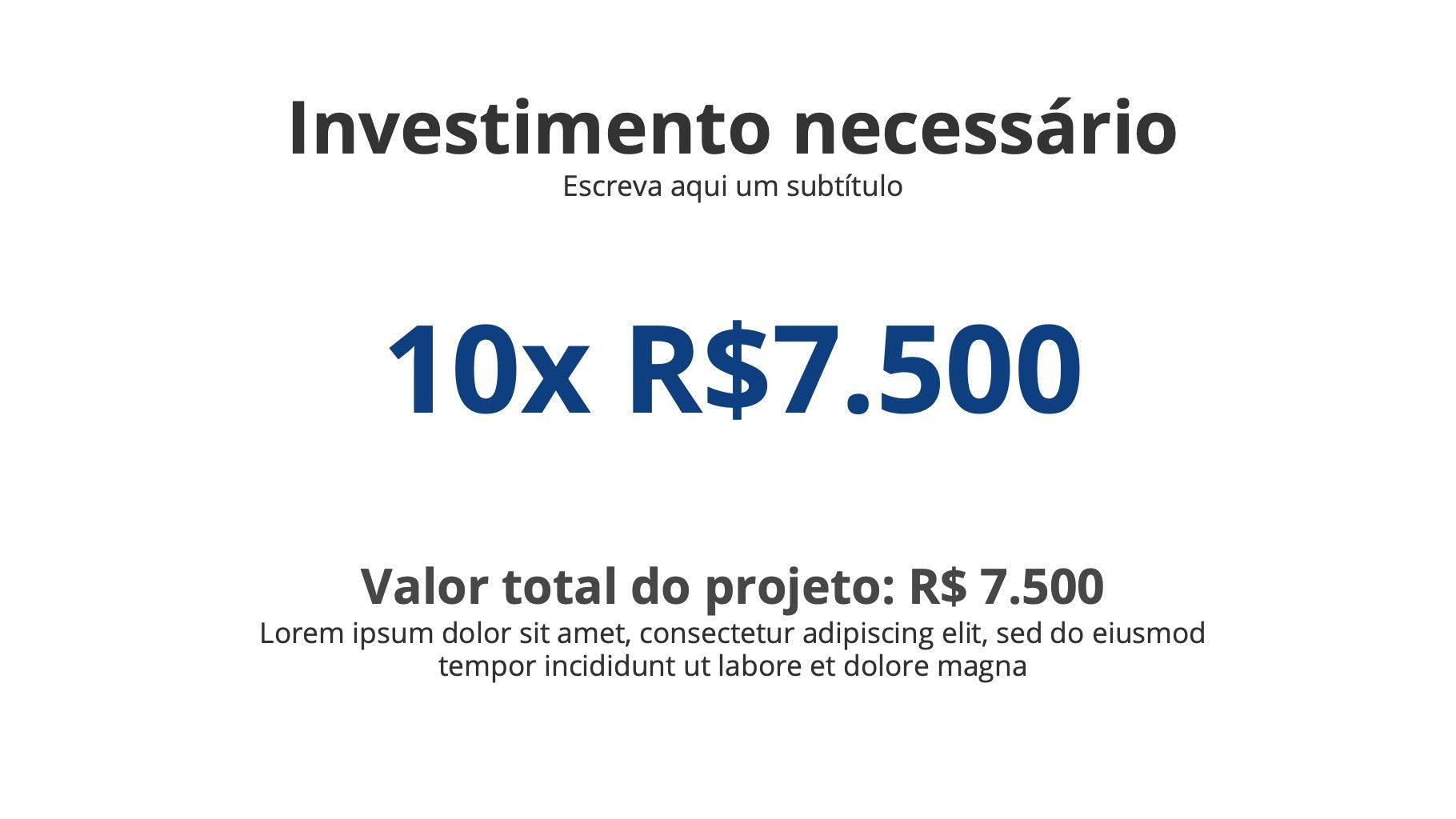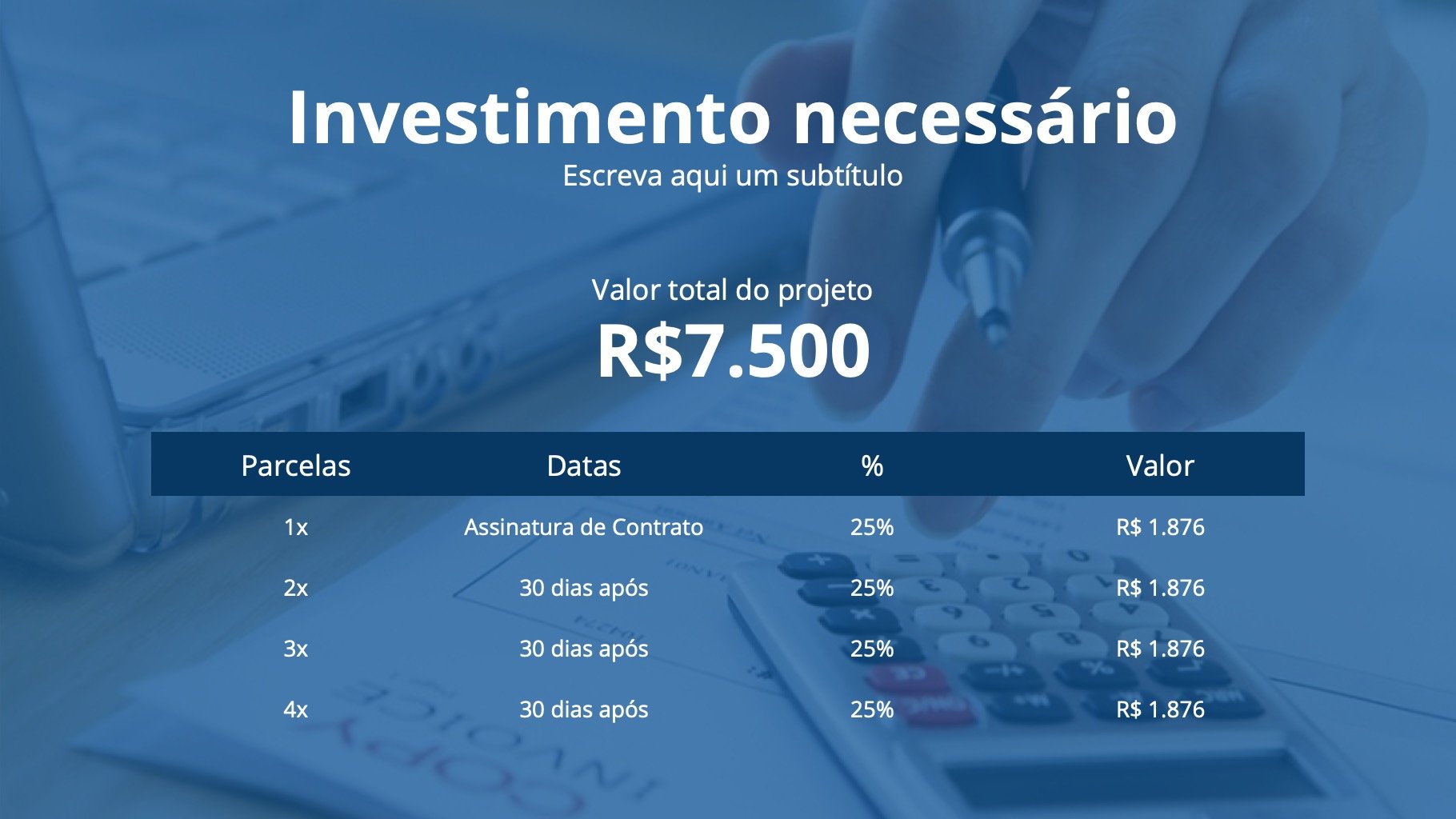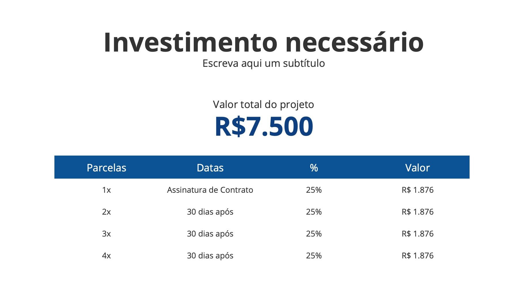 • Custo: É importante justificar o valor do investimento então, além do valor a ser investido, é importante mostrar também o que levou você, como consultor, a fazer os cálculos de quanto cobrar.