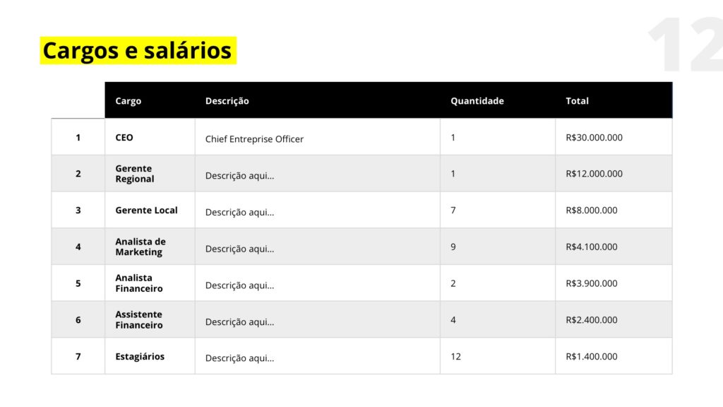 Contando com 16 slides prontos para baixar 100% editáveis, a apresentação permite que você customize cores, textos, imagens e tudo mais para colocar a identidade e o conteúdo de sua empresa.