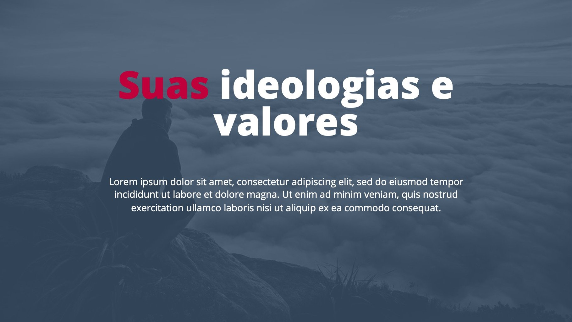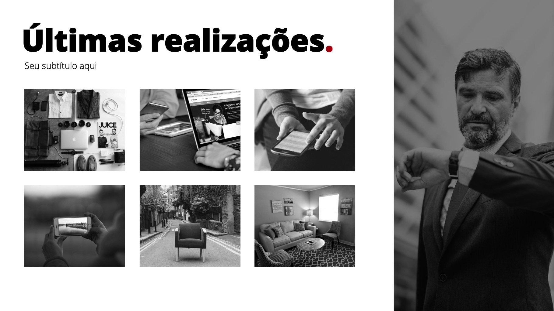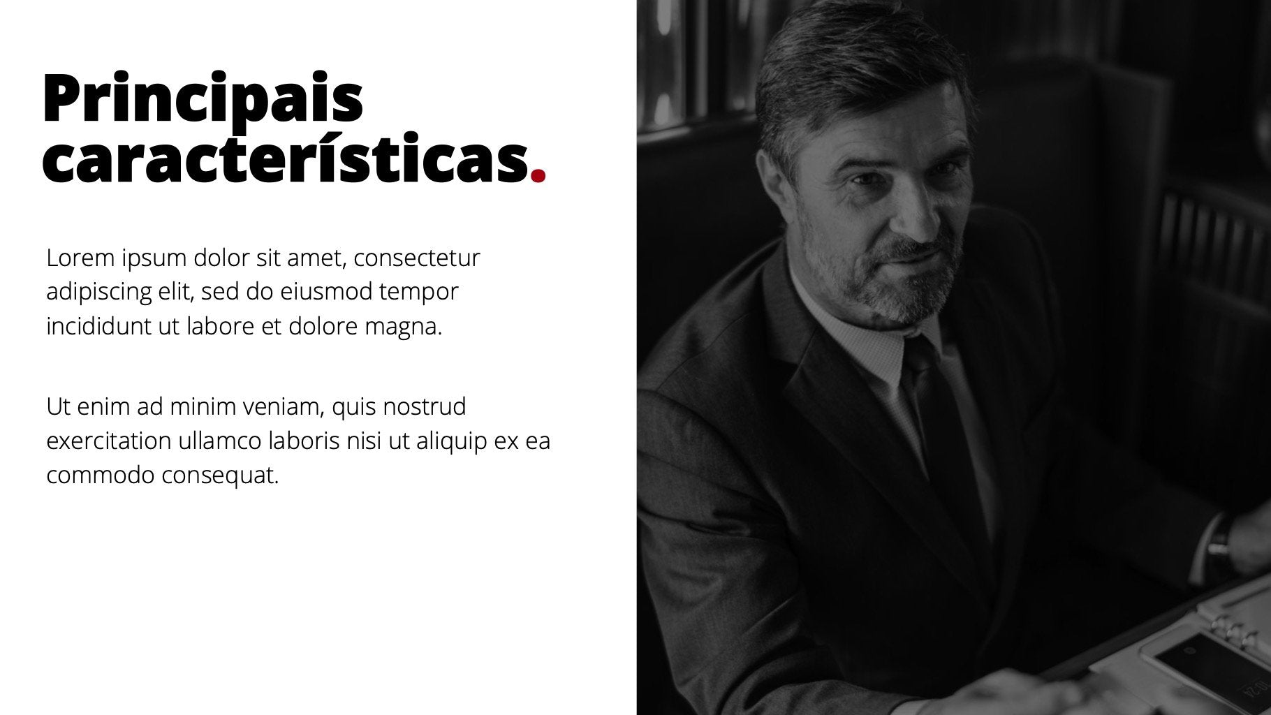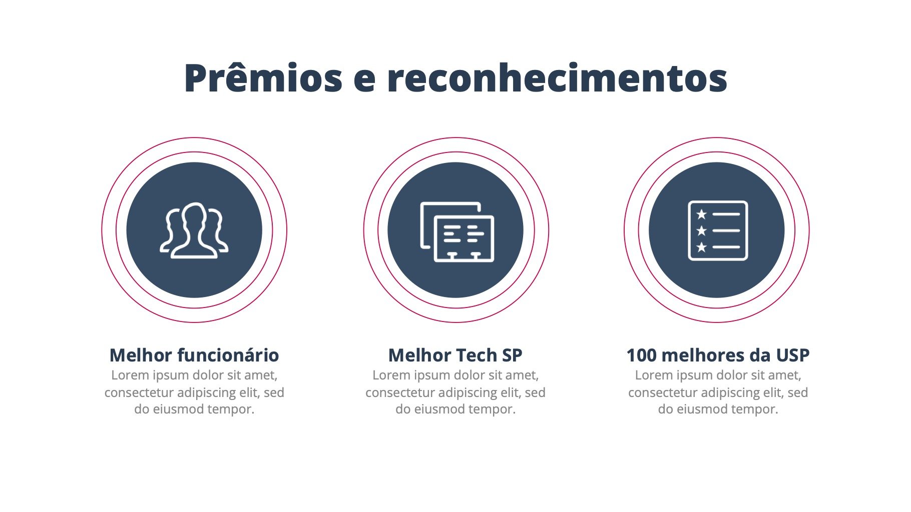 Com placeholder de imagens: O placeholder é um espaço reservado para imagens. Cada slide tem seu placeholder específico para inserir fotos de fundo, membros da equipe, produtos, etc. O placeholder pode ser retangular ou elíptico, mas bastará que você arraste sua imagem para dentro do elemento e a imagem toma a forma desse elemento automaticamente! É muita facilidade.