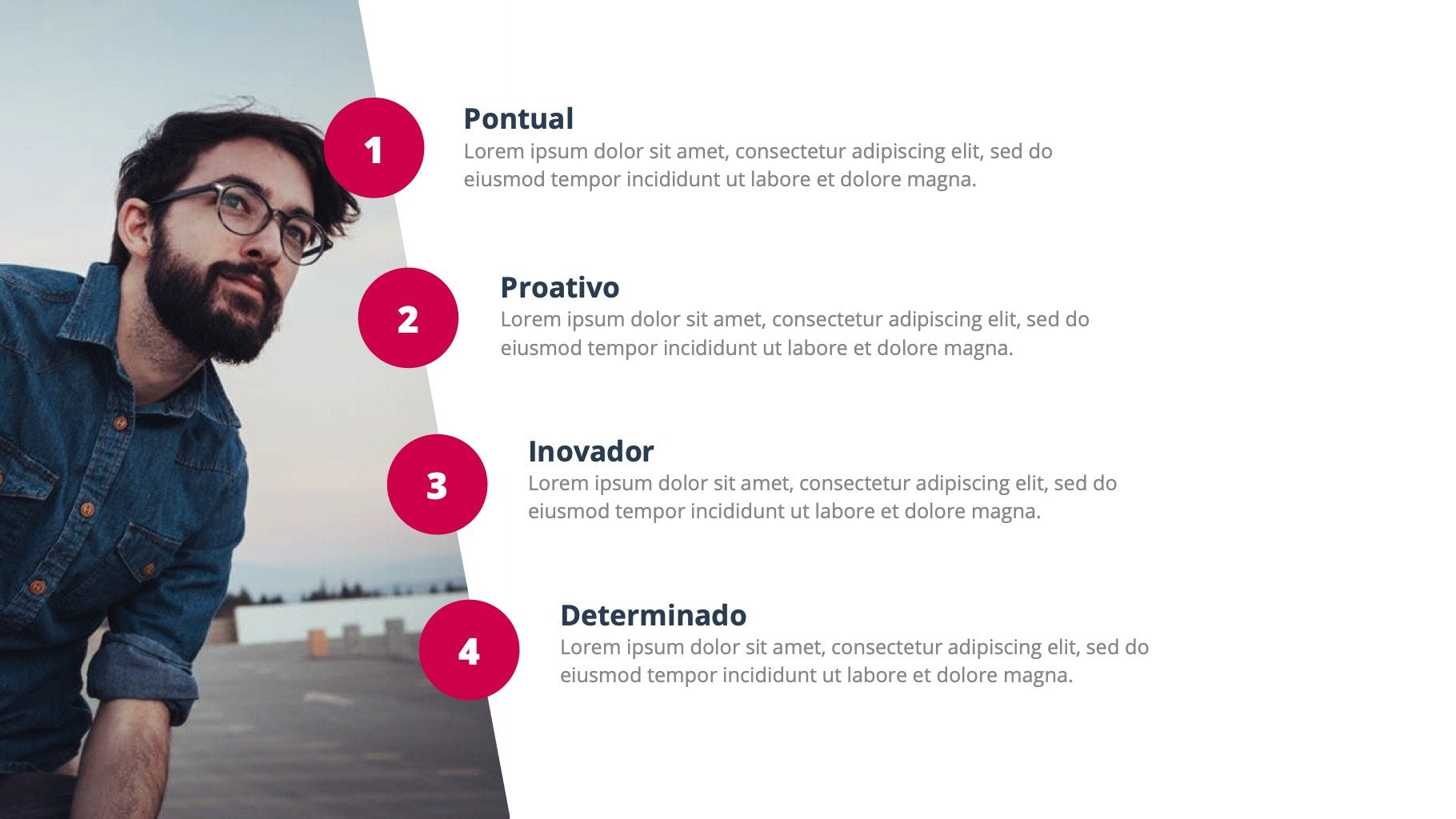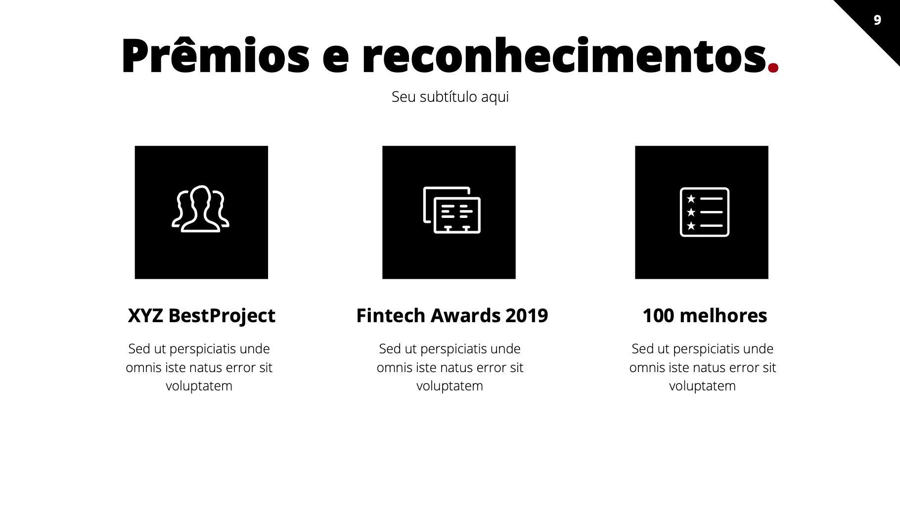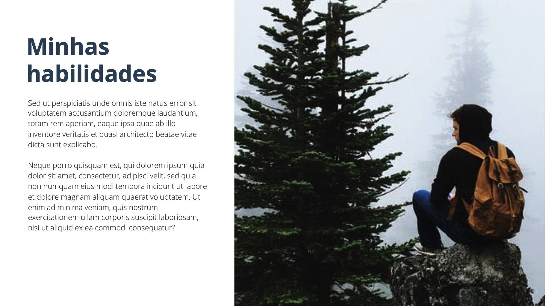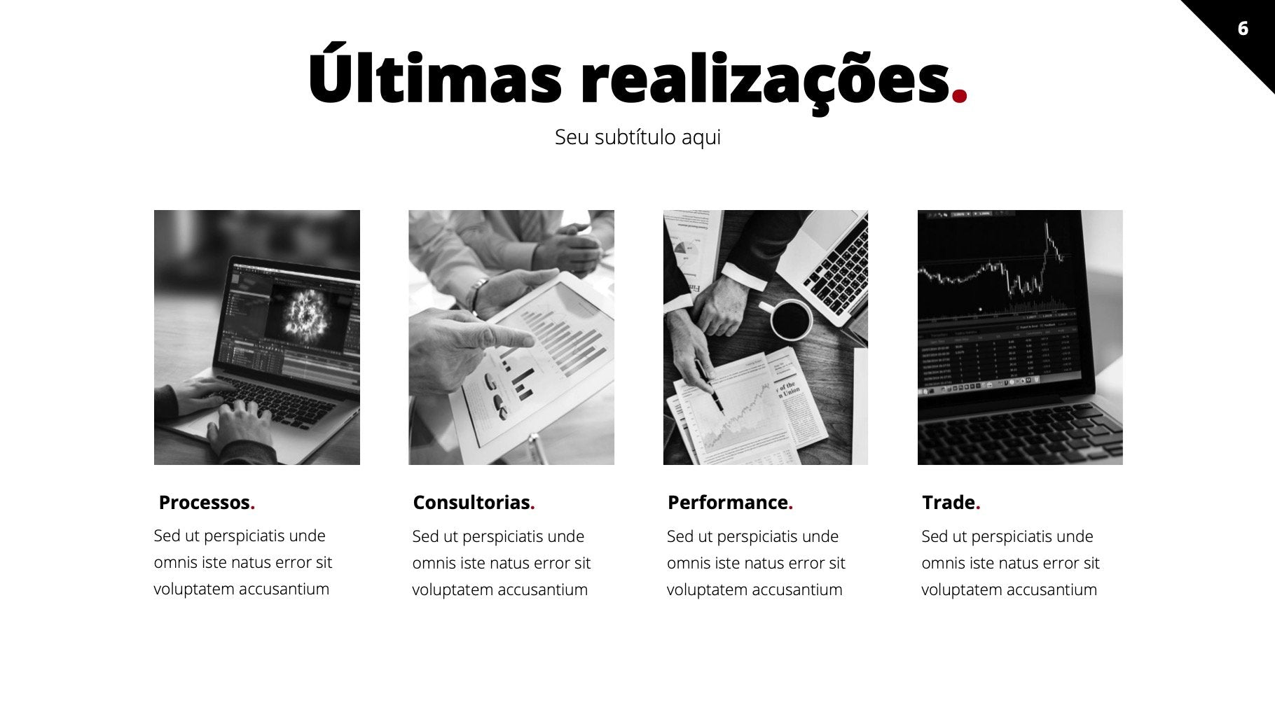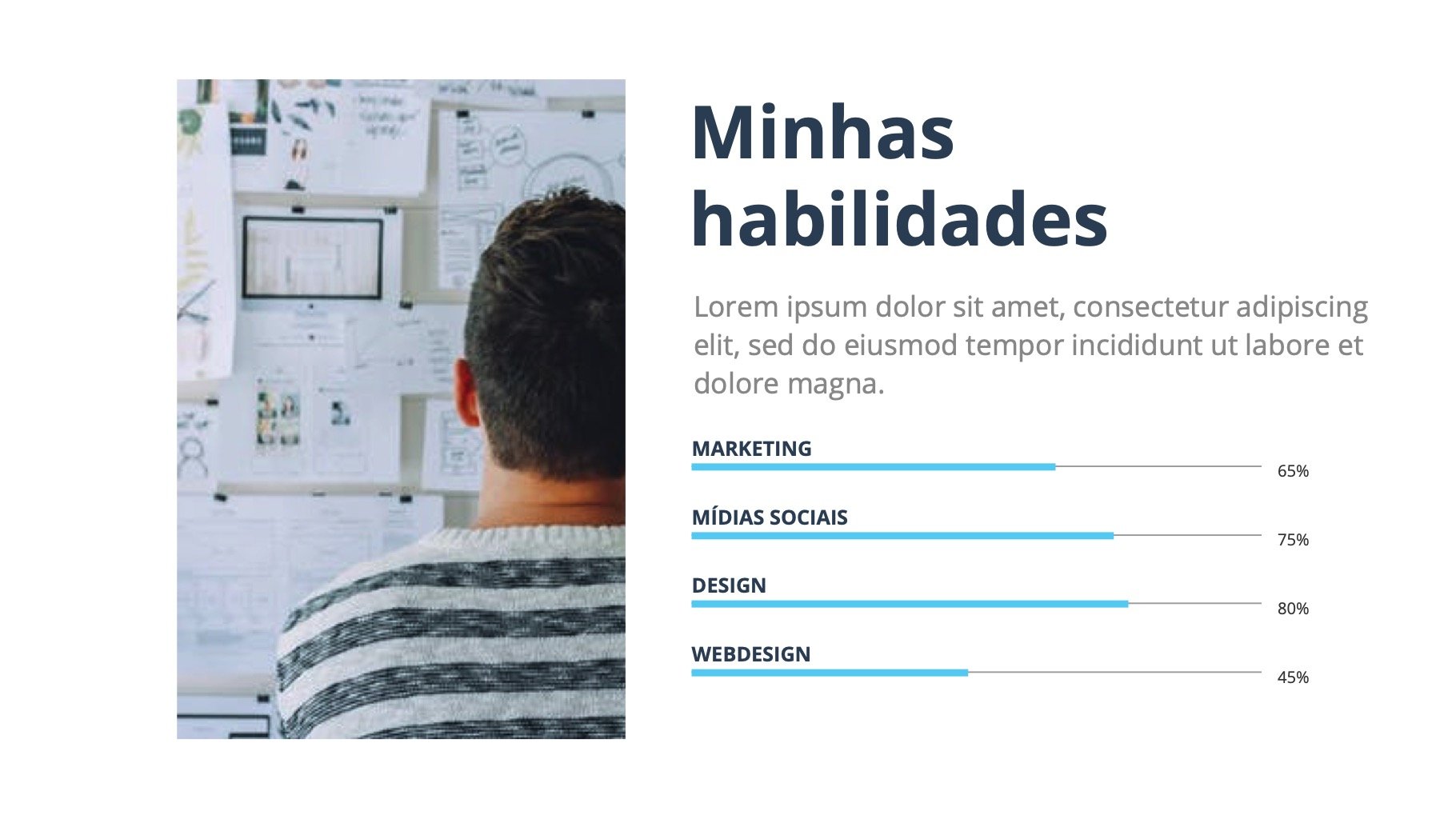 Com placeholder de imagens: O placeholder é um espaço reservado para imagens. Cada slide tem seu placeholder específico para inserir fotos de fundo, membros da equipe, produtos, etc. O placeholder pode ser retangular ou elíptico, mas bastará que você arraste sua imagem para dentro do elemento e a imagem toma a forma desse elemento automaticamente! É muita facilidade.