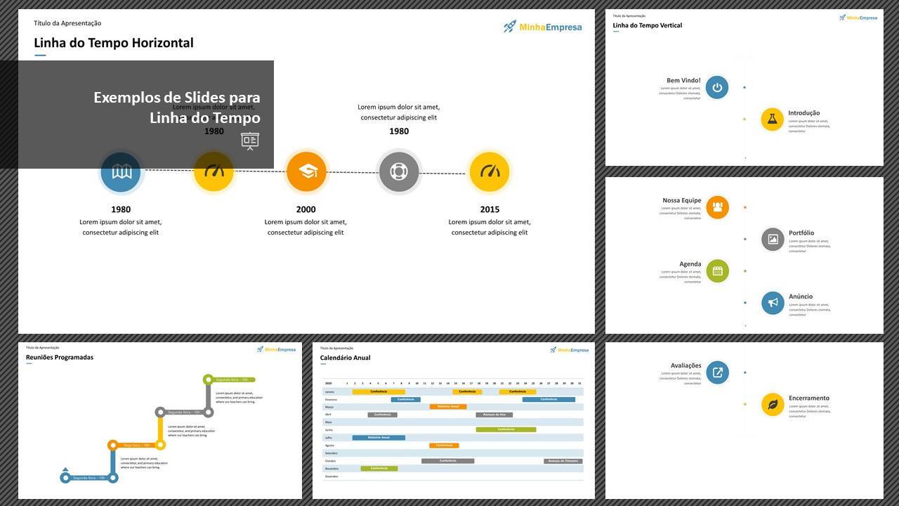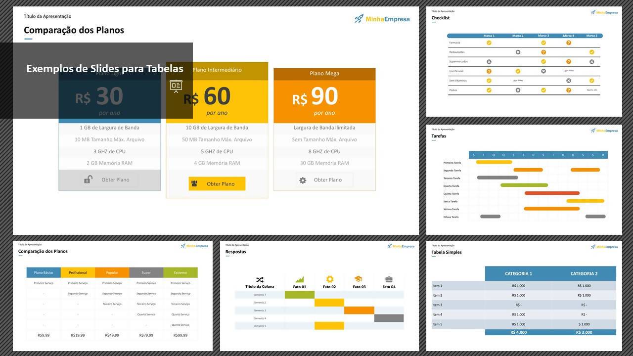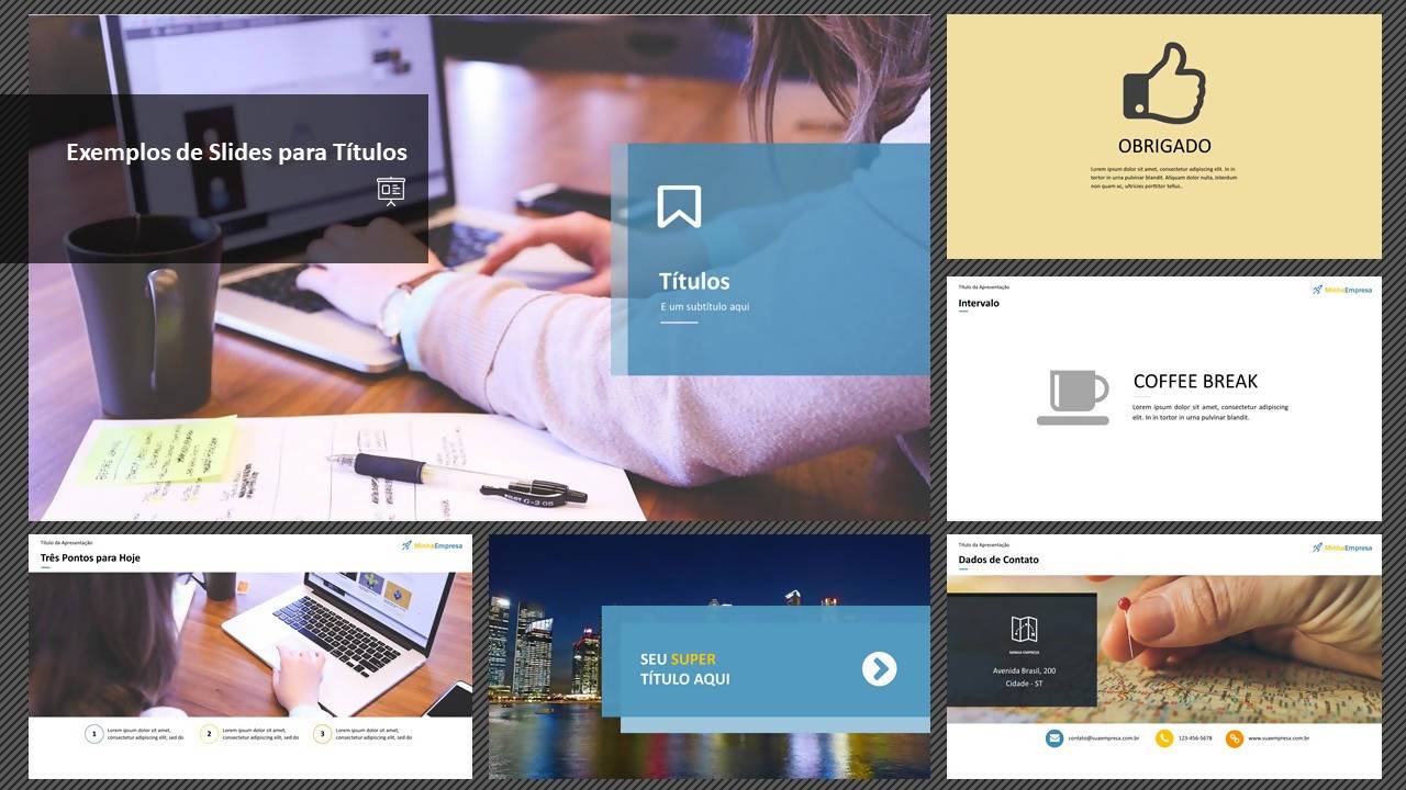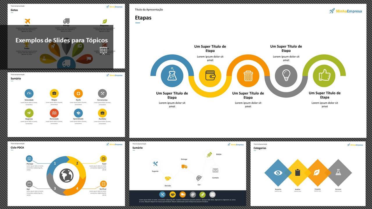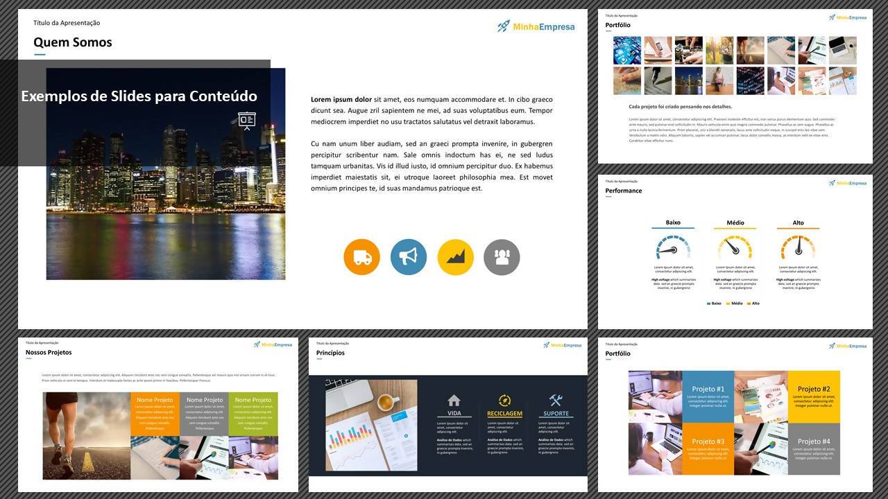 Abaixo você pode ver exemplos de slides do template, ou ver uma versão completa em PDF neste link: