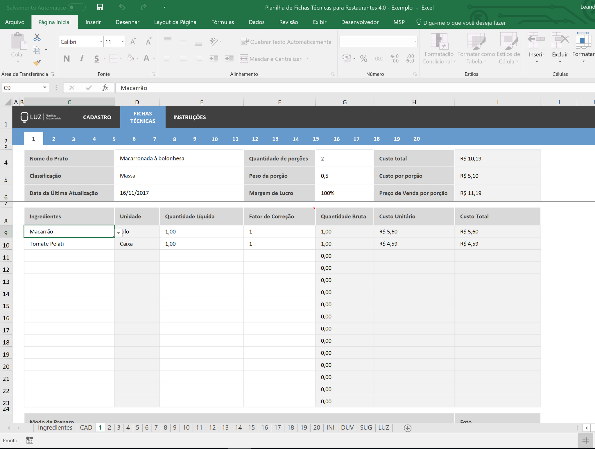 Planilha de Ficha Técnica para RestaurantesCom essa planilha, você vai conseguir listar todos os ingredientes e custos dos seus pratos para analisar sua necessidade de matéria prima e também lucratividade.