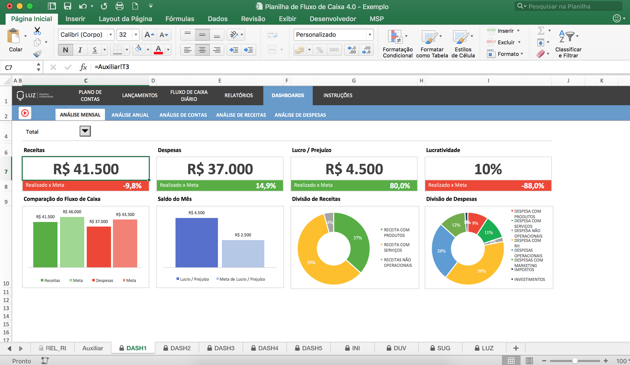 A planilha de fluxo de caixa que todo negócio precisa para ter um controle de entradas e saídas bem feito, agora na versão 4.0! Ela possui 5 dashboards prontos, relatórios automáticos, classificação de contas e controle de status de pagamento. Com ela, você vai conseguir visualizar rapidamente a saúde financeira do seu negócio para tomar decisões mais seguras.