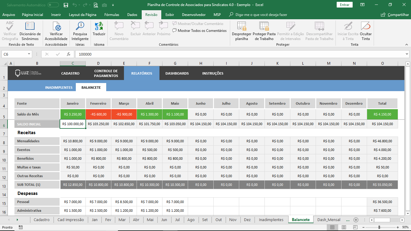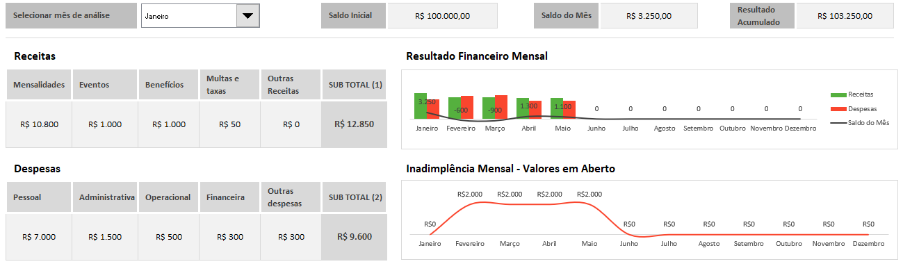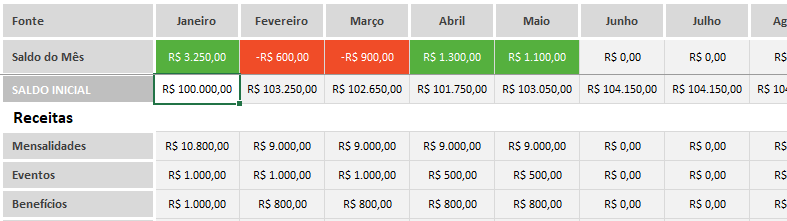 Relatório com as informações de todas as receitas, despesas e o saldo financeiro mensal de acordo com o preenchimento da planilha