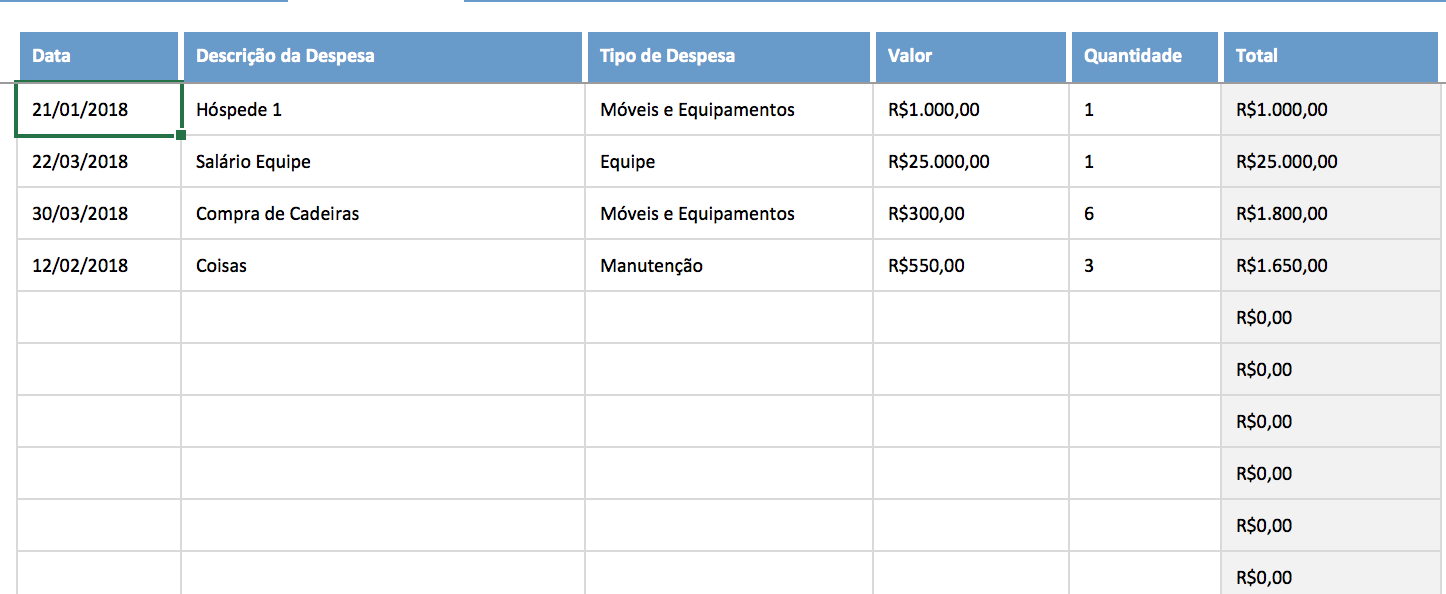 Além das despesas referentes à reserva que devem ser cadastradas na aba de reservas, você também contará com uma aba específica para as despesas gerais do seu hotel como compras, manutenção, equipe, predial, etc. Isso será contabilizado junto com suas receitas para formar seu fluxo de caixa.