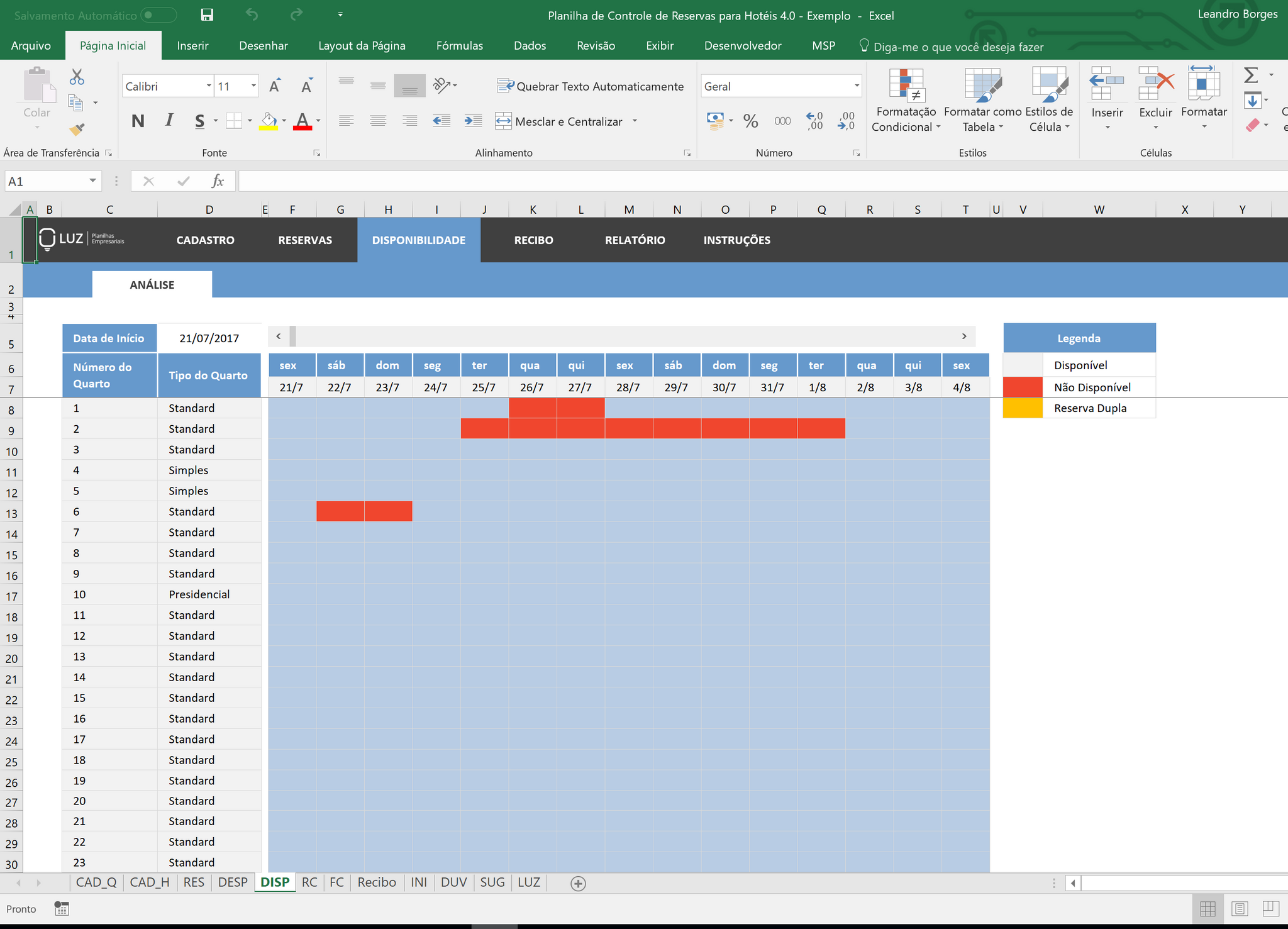 O principal recurso da planilha é a possibilidade de você ver todas as reservas por período e ver quais dias de quais quartos estão disponíveis para reserva!
