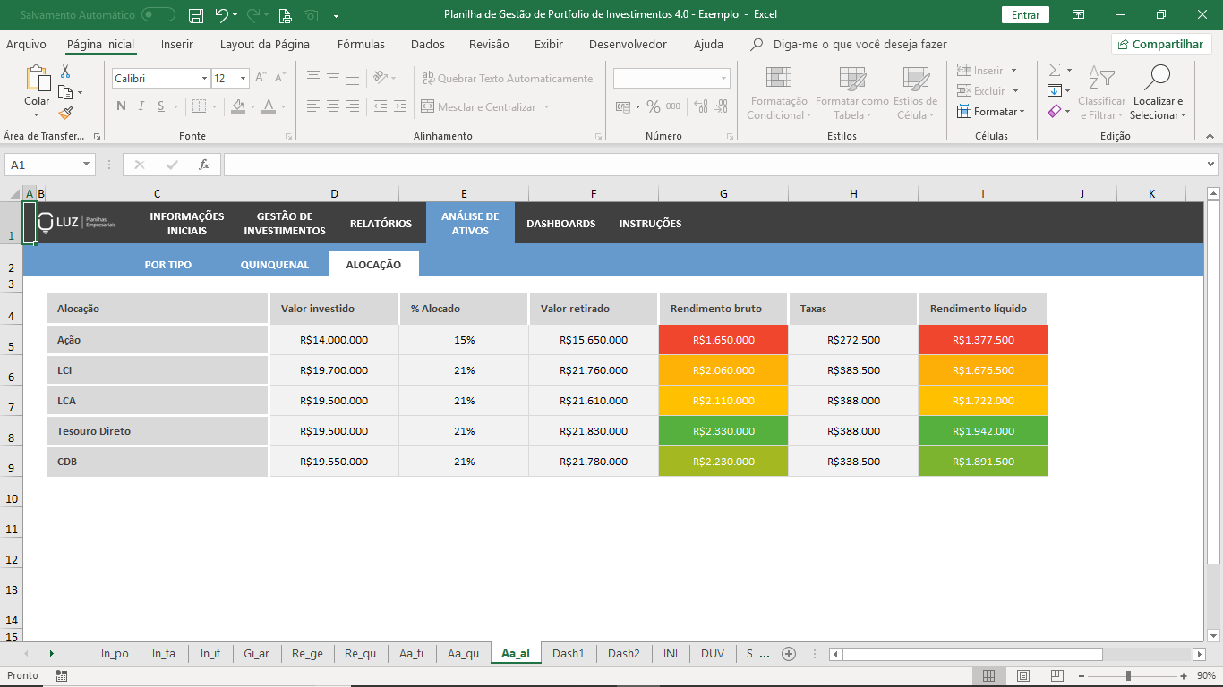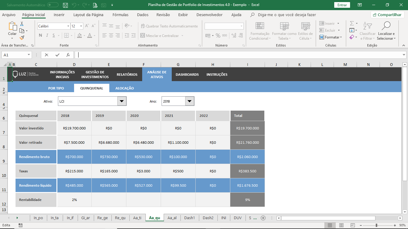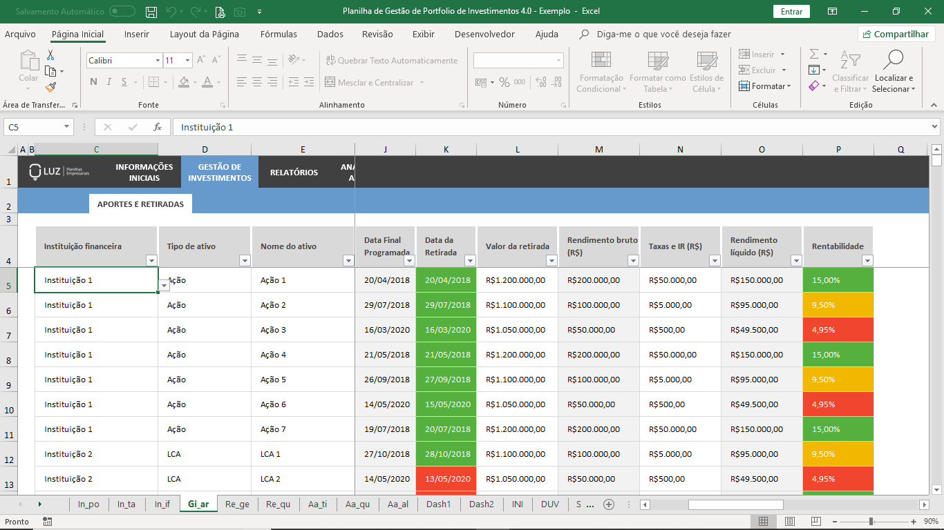 Sempre que fizer um novo aporte ou retirada de um investimento, registre todas as informações como rentabilidade esperada, data do investimento, prazo mínimo, valor investido, valor de retirada, rendimento bruto, taxas, rendimento líquido e rentabilidade real