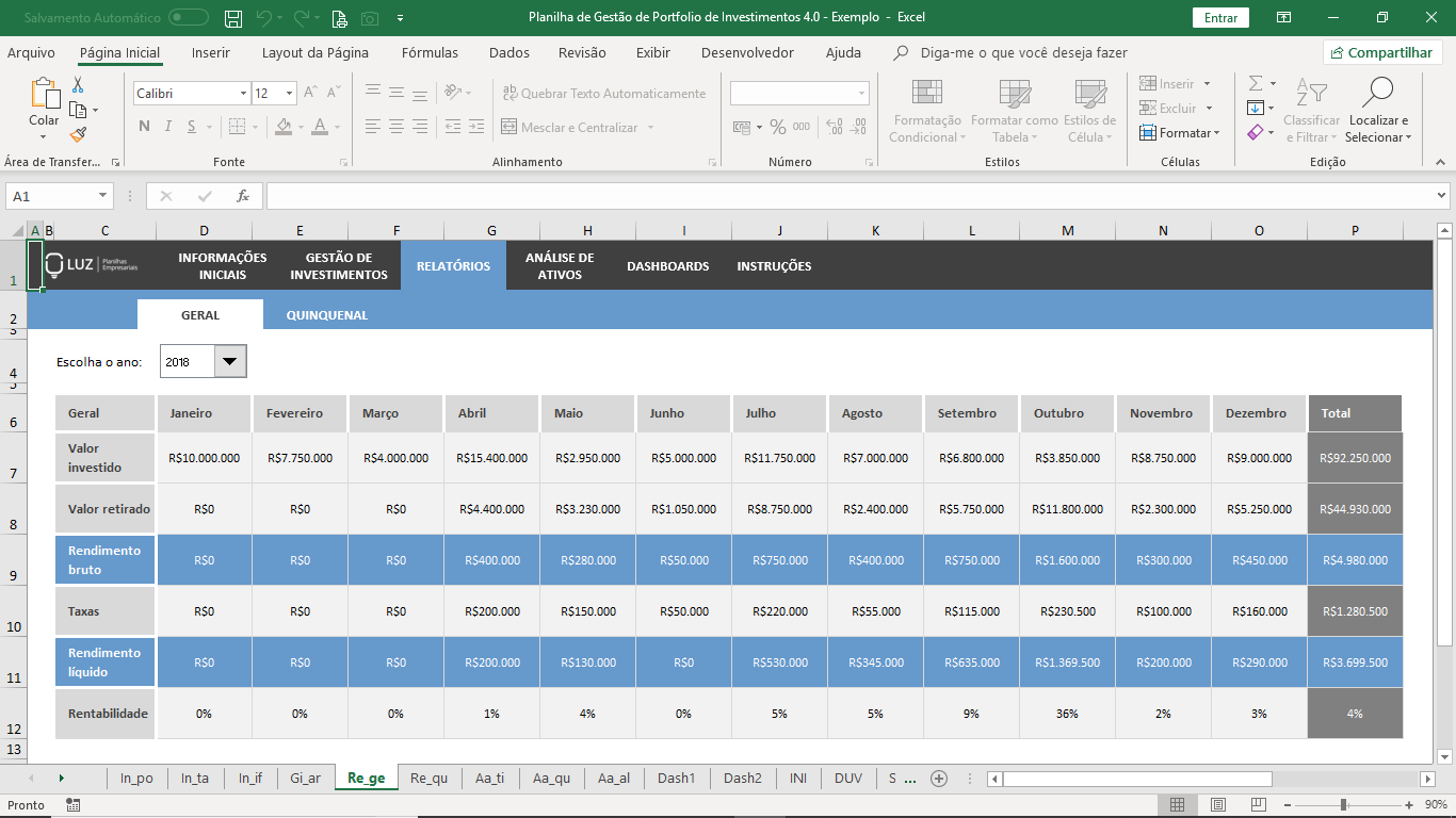Visão automática mensal e anual (para análises de 5 anos) com o valor investido, retirado, rendimento bruto, taxas e rendimento líquido obtido mensalmente com o seu portfolio de investimentos