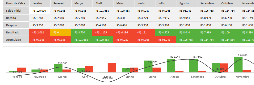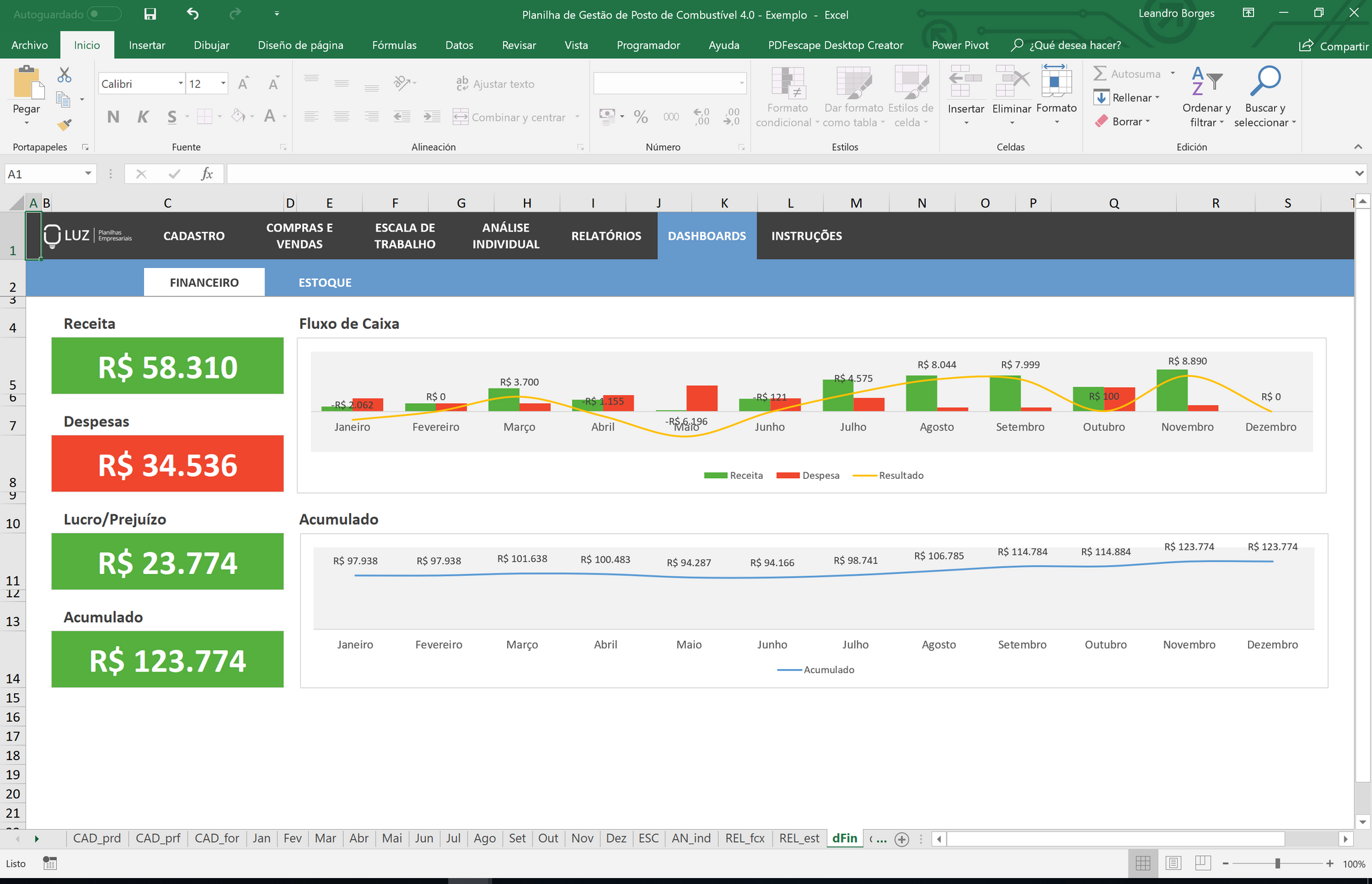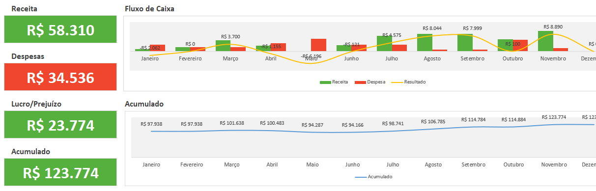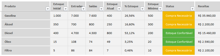 Acompanhamento de receitas e despesas mensal que mostra se seu posto de combustível está tendo lucro ou prejuízo
