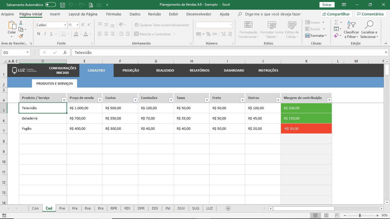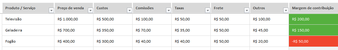 Faça o registro de todos os produtos ou serviços que sua empresa comercializa, defina seu preço, os custos e veja a margem de contribuição de cada um deles. Cuidado para o aviso de itens com MC negativa.