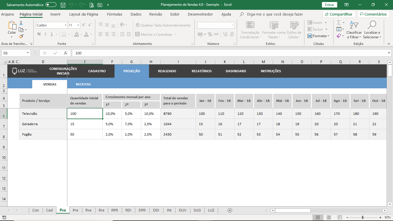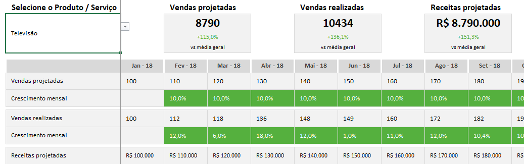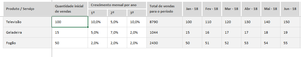Estabeleça uma quantidade inicial de vendas, taxas de crescimento das vendas mensalmente e visualize automaticamente a projeção de vendas e receitas para a quantidade de meses definido inicialmente