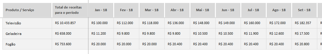 Escolha um produto ou serviço e veja o comparativo entre as vendas e receitas que você planejou para ele individualmente e o que aconteceu de fato