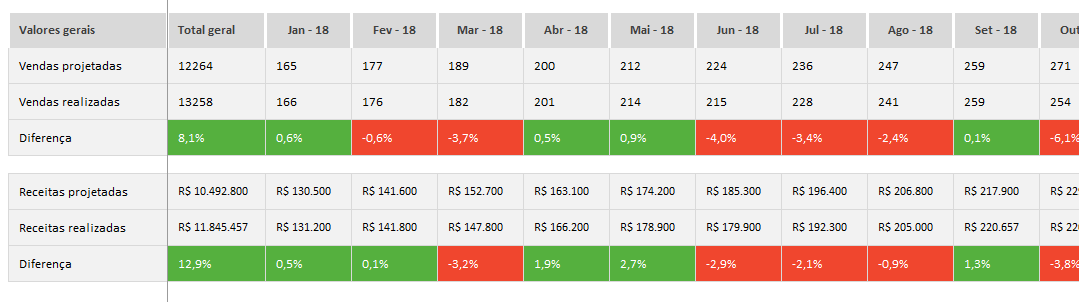 Relatório comparativo entre as vendas planejadas e o seu resultado de fato. Automaticamente você recebe avisos de cor nos meses de acordo com a sua performance