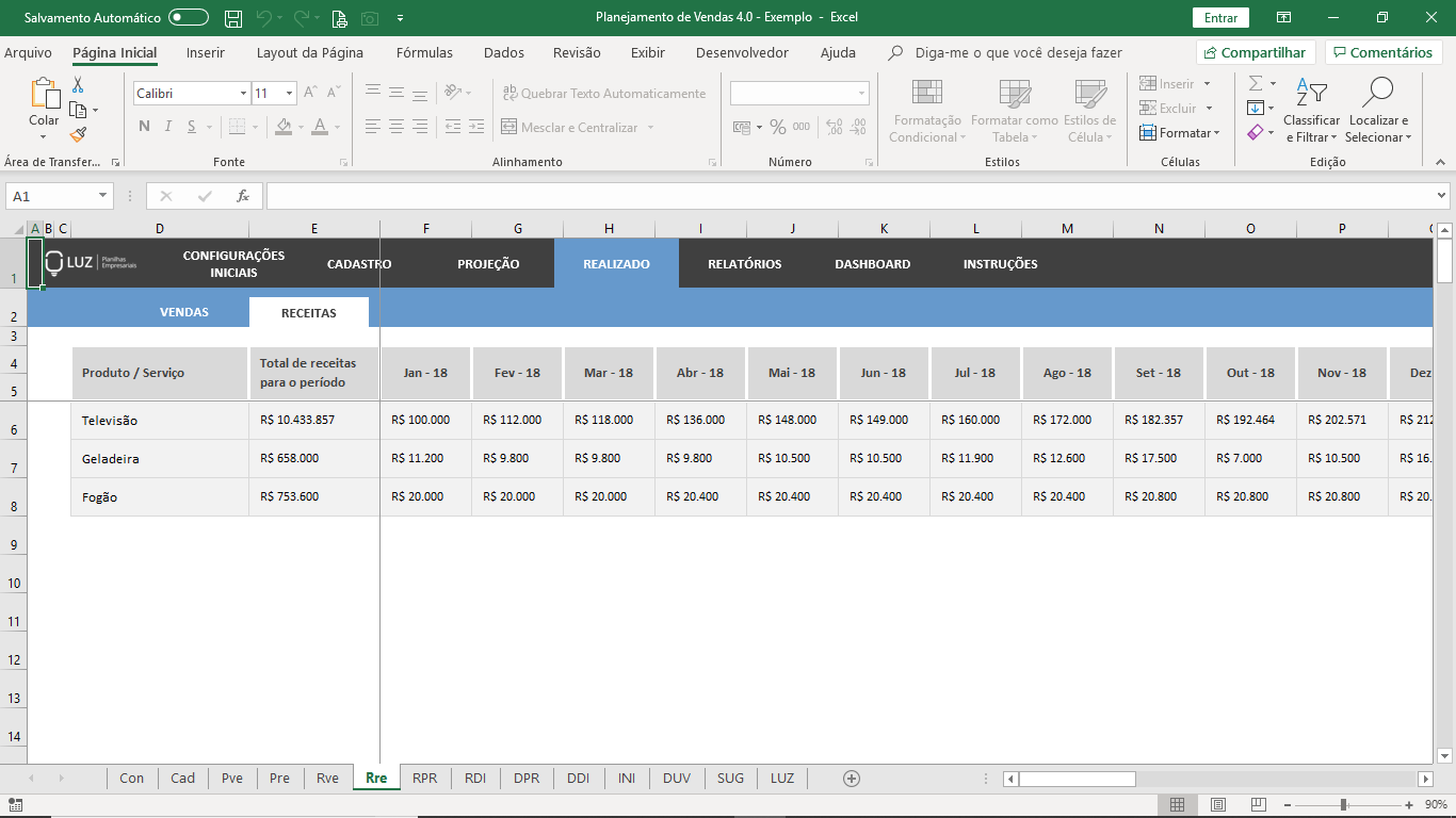 Preencha a planilha com as vendas que a sua empresa realizar mês a mês para ver automaticamente as receitas geradas. Essa é a base para as comparações entre o projetado e o realizado.