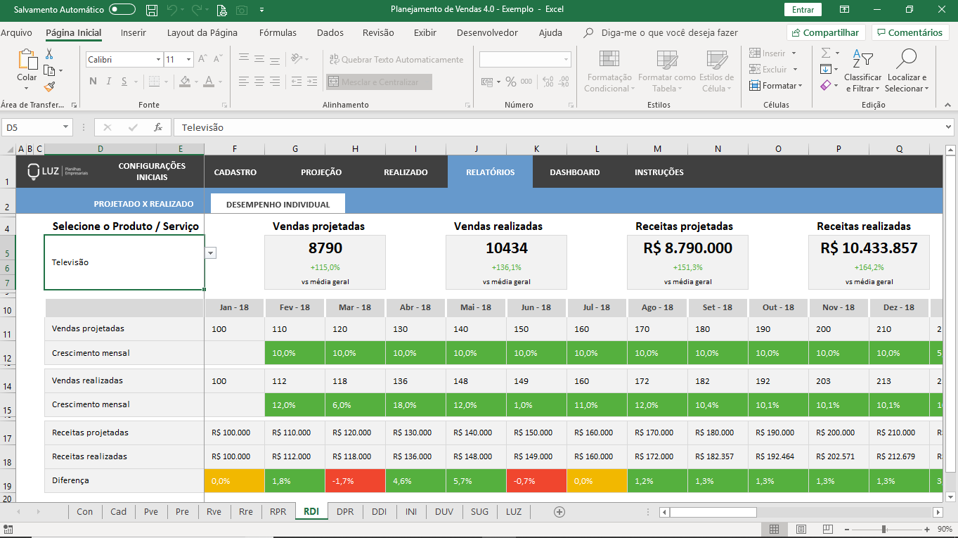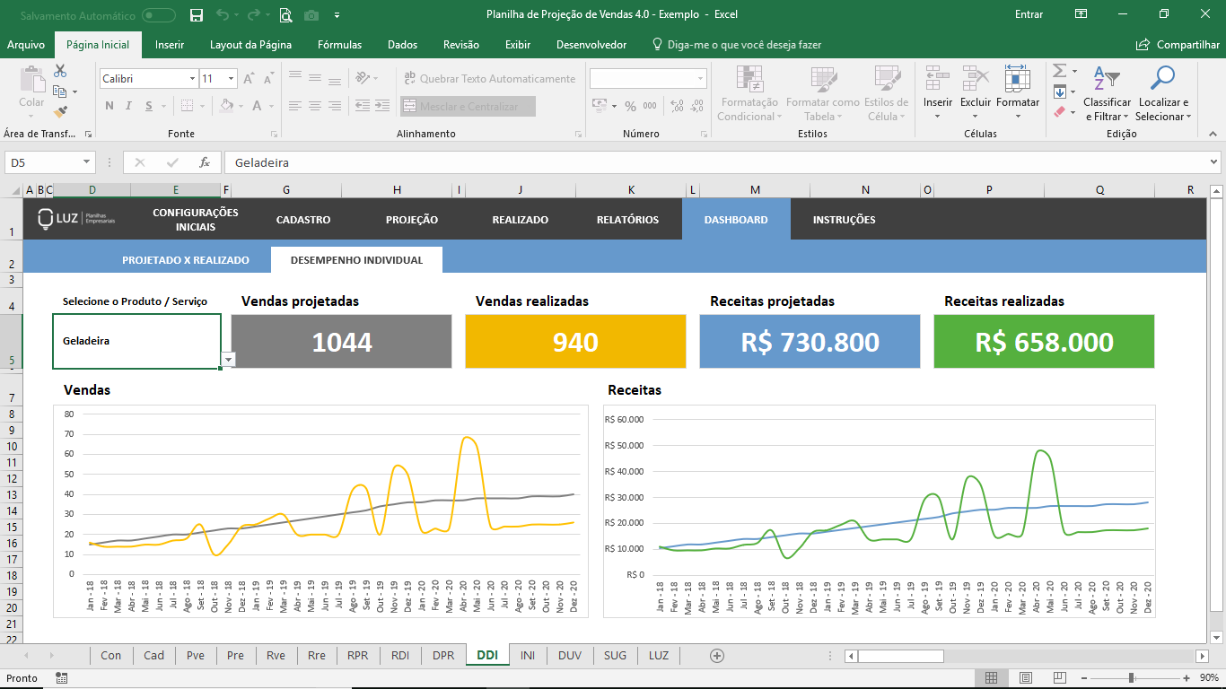 Visualize um painel de controle em uma única tela com os principais indicadores (vendas e receitas) projetados e realizados, bem como dois gráficos mensais para uma análise mais detalhada