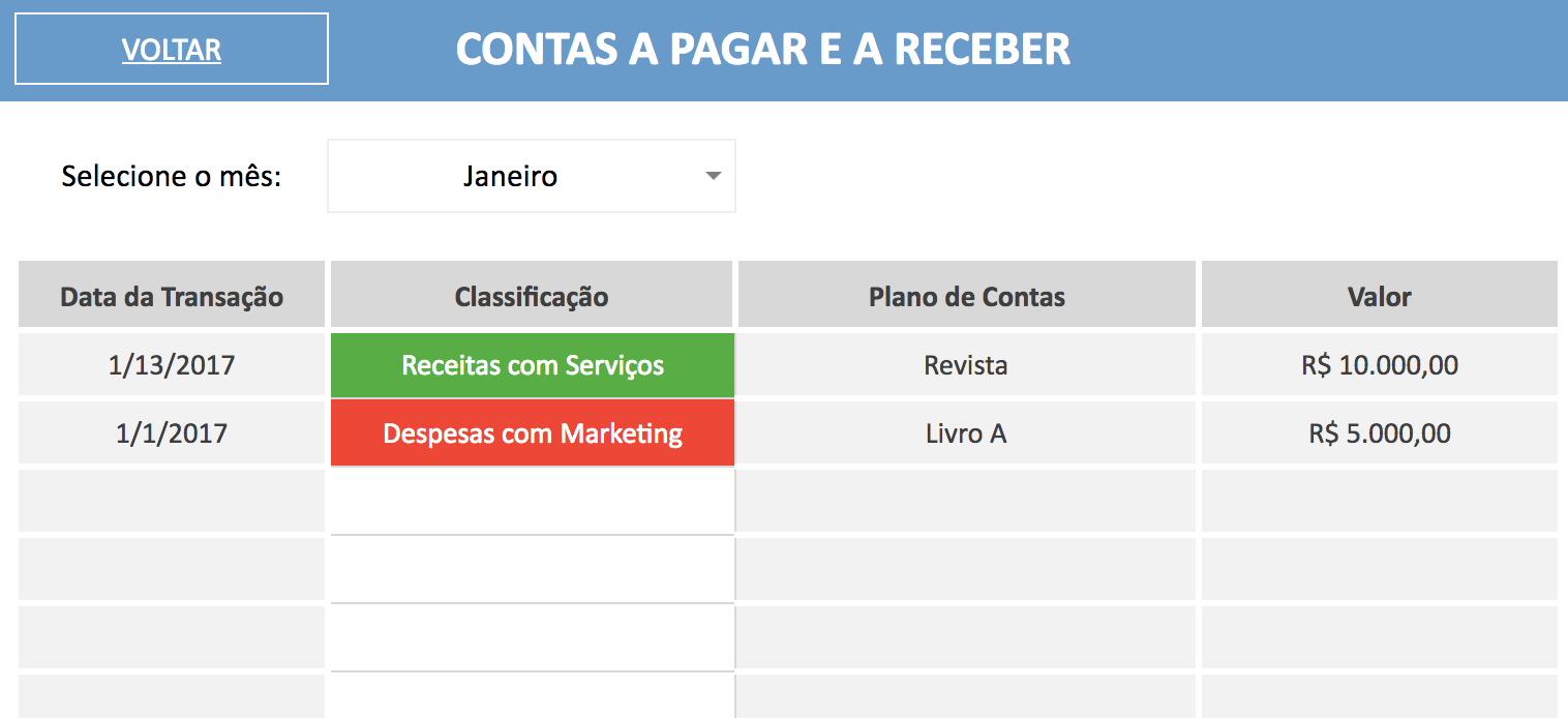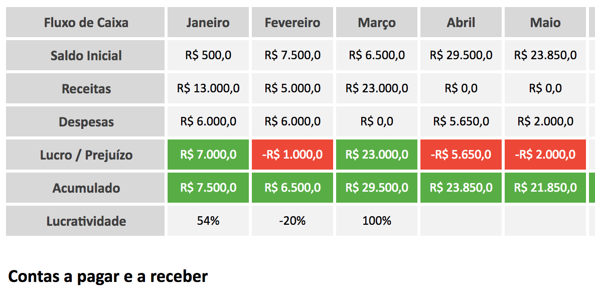 Por fim, a planilha também possui uma área específica para o controle das contas a pagar e a receber.