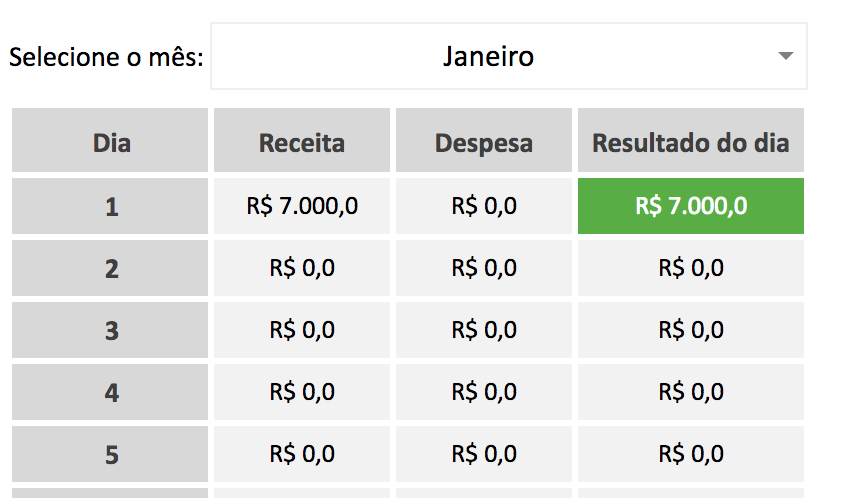 Além do fluxo anual, você também conseguirá detalhar os resultado por dia, escolhendo cada mês que quer ver em detalhes. Esta parte da ferramenta servirá como sua planilha de gasto e planilha de vendas.